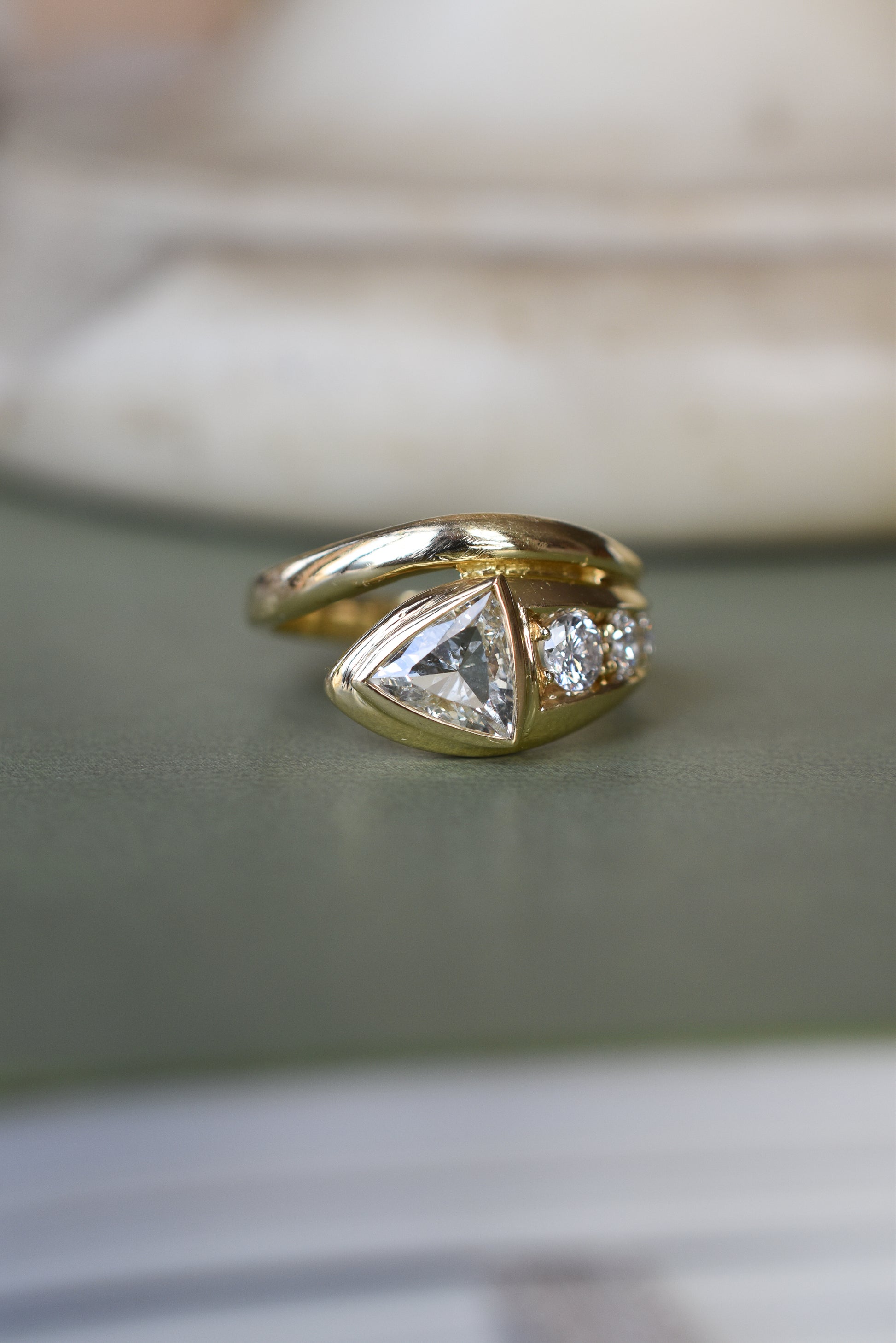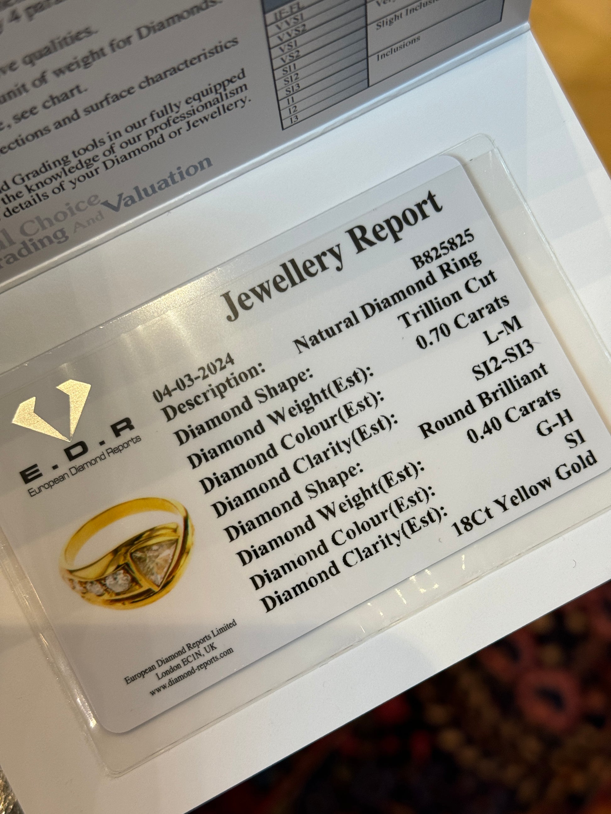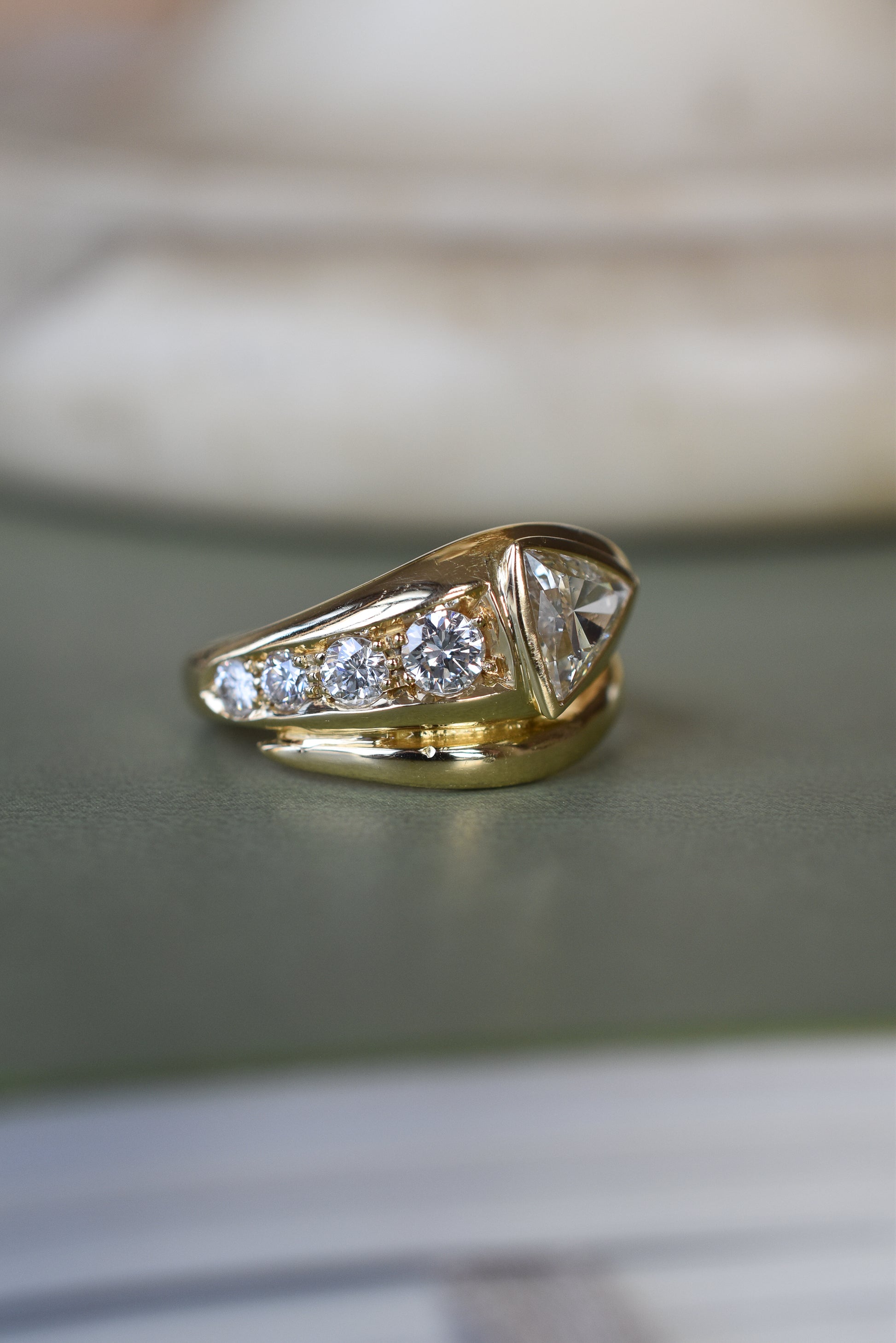 An exquisite and unique 1.10ct Vintage Diamond Snake Ring crafted in 18k Yellow Gold. The snake's head showcases a vibrant 0.70ct Natural Trillion-cut Diamond with a subtle warm undertone, complemented by 0.40cts of round brilliant cut diamonds adorning its body. This ring is meticulously crafted in solid 18k Yellow Gold and comes with a Gemmological Report issued by E.D.R. Lab in London (refer to attached report).