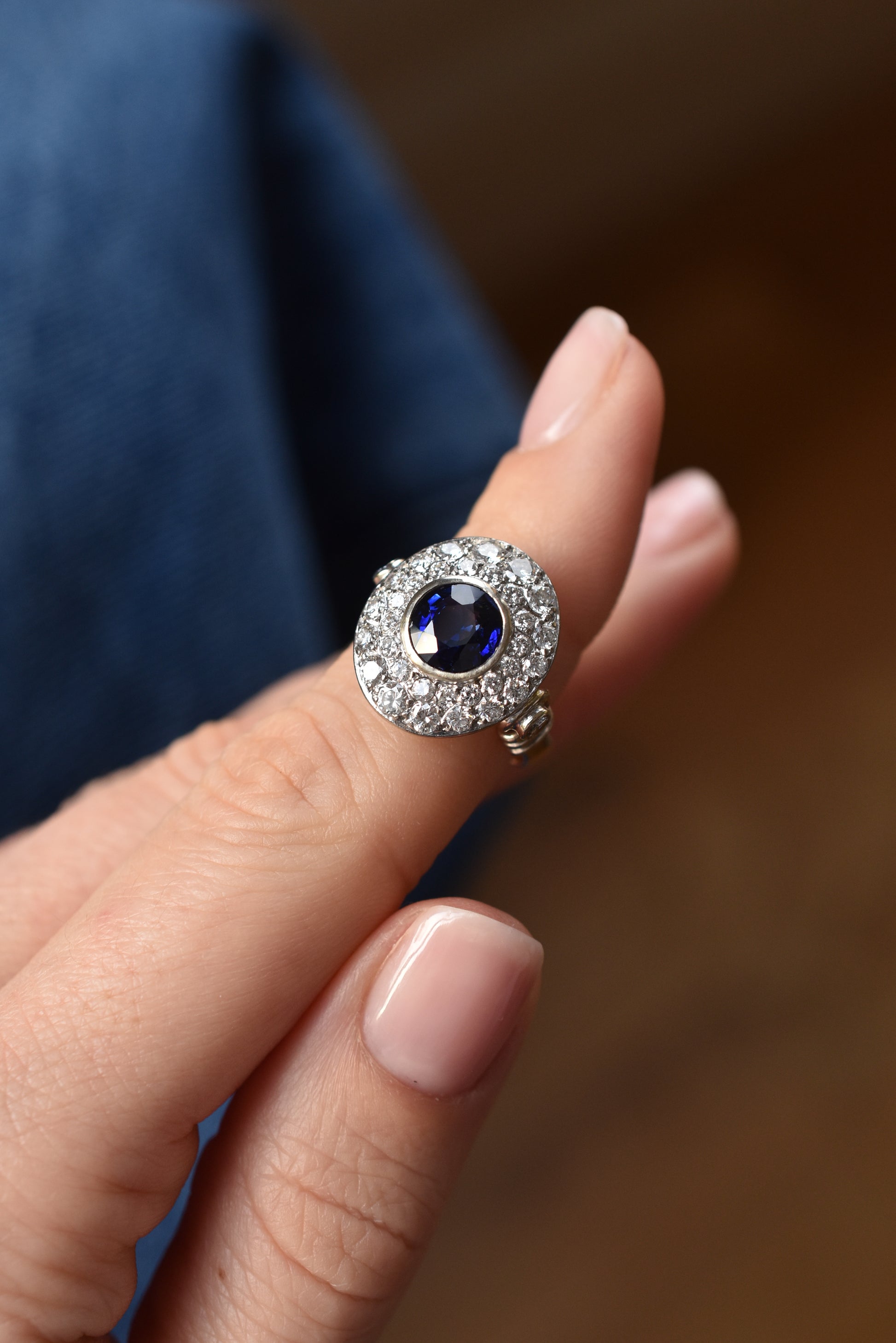 The ring boasts 34 round diamonds totalling approximately 1.50 Carats (F/G Colour, SI Clarity). At its center lies a magnificent 1.40 Carat deep blue sapphire, showcasing exceptional color. The band, crafted in 18k white gold, features two diamonds and intricate scroll details on the shoulders. Perfect as an alternative engagement ring, this stunning French Ring includes a Full Gemmological Report from E.D.R. Lab in London (see attached report for details).