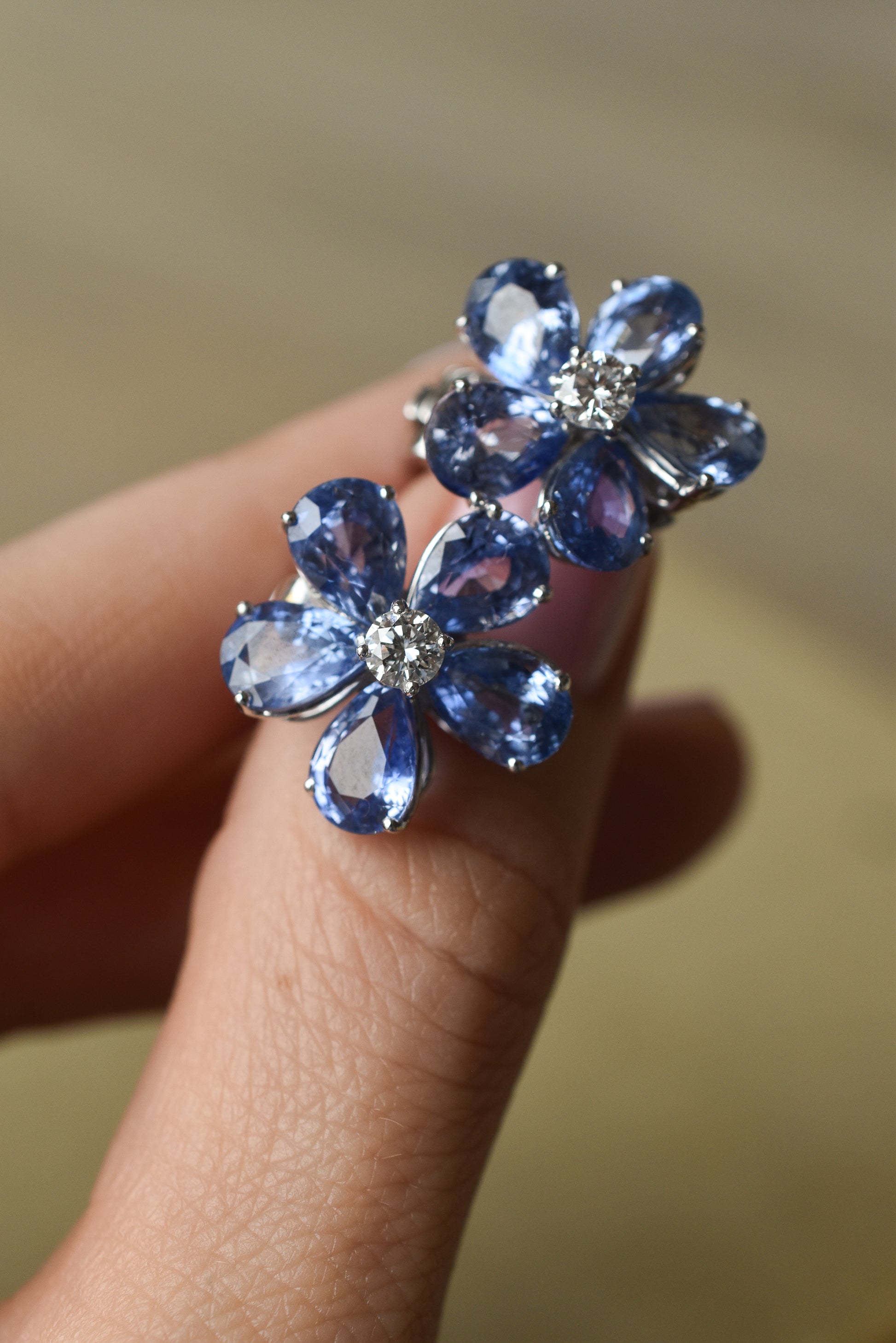 A fabulous pair of Vintage Ceylon Sapphire and Diamond Flower Earrings mounted in Platinum. Holding 10 carats of Ceylon pear shaped sapphires with a fabulous almost lilac blue hue and excellent transparency, further embellished by two round-cut diamonds for a total weight of 0.60 carats (H-I colour, VS Clarity).
