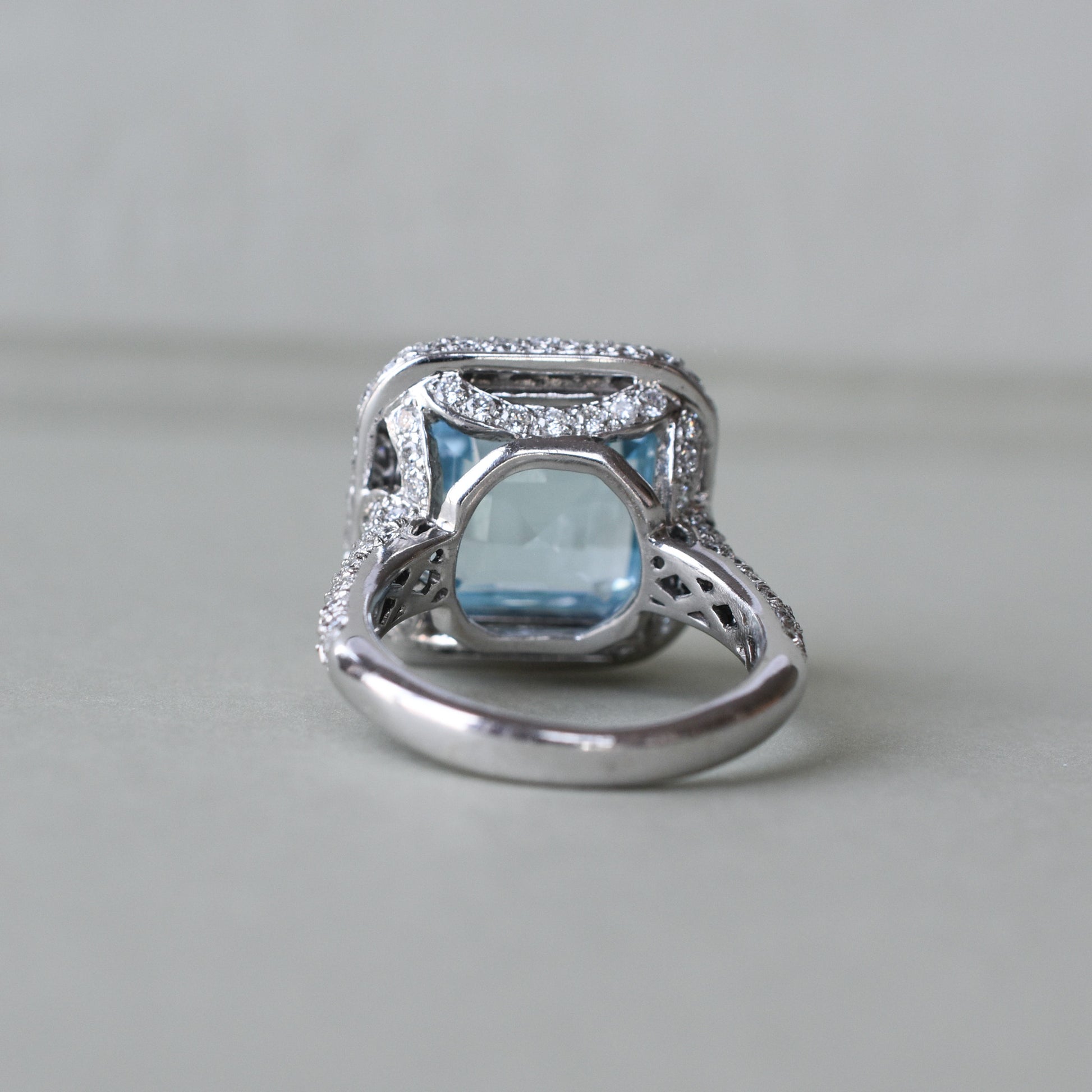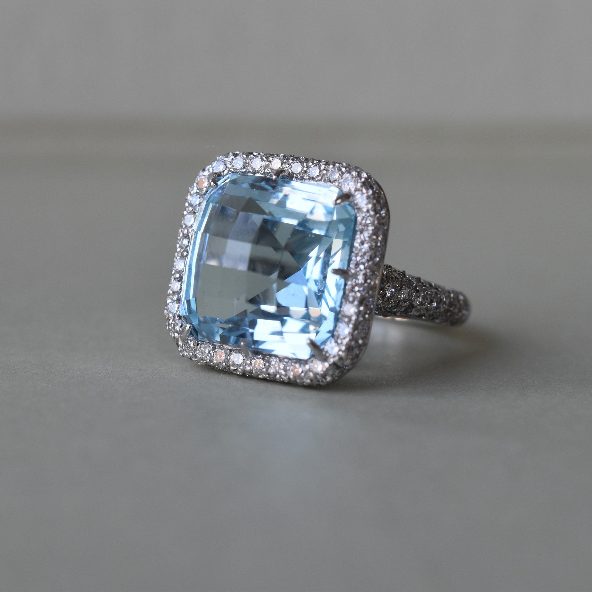 This impressive ring showcases a 15 Carat natural square fancy cut topaz of a beautiful and delicate light blue, framed by a cluster of brilliant-cut diamonds set in 18k white gold.