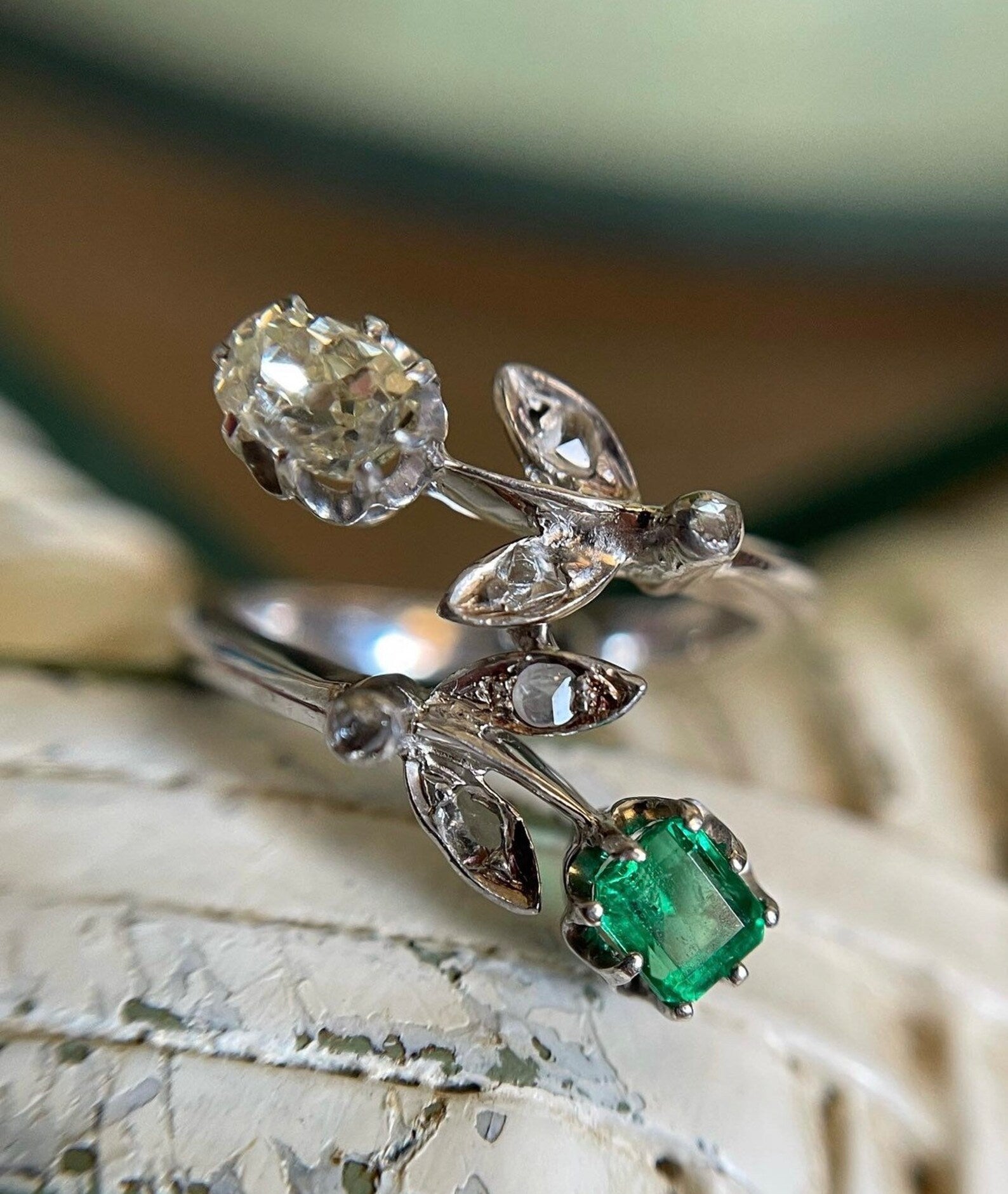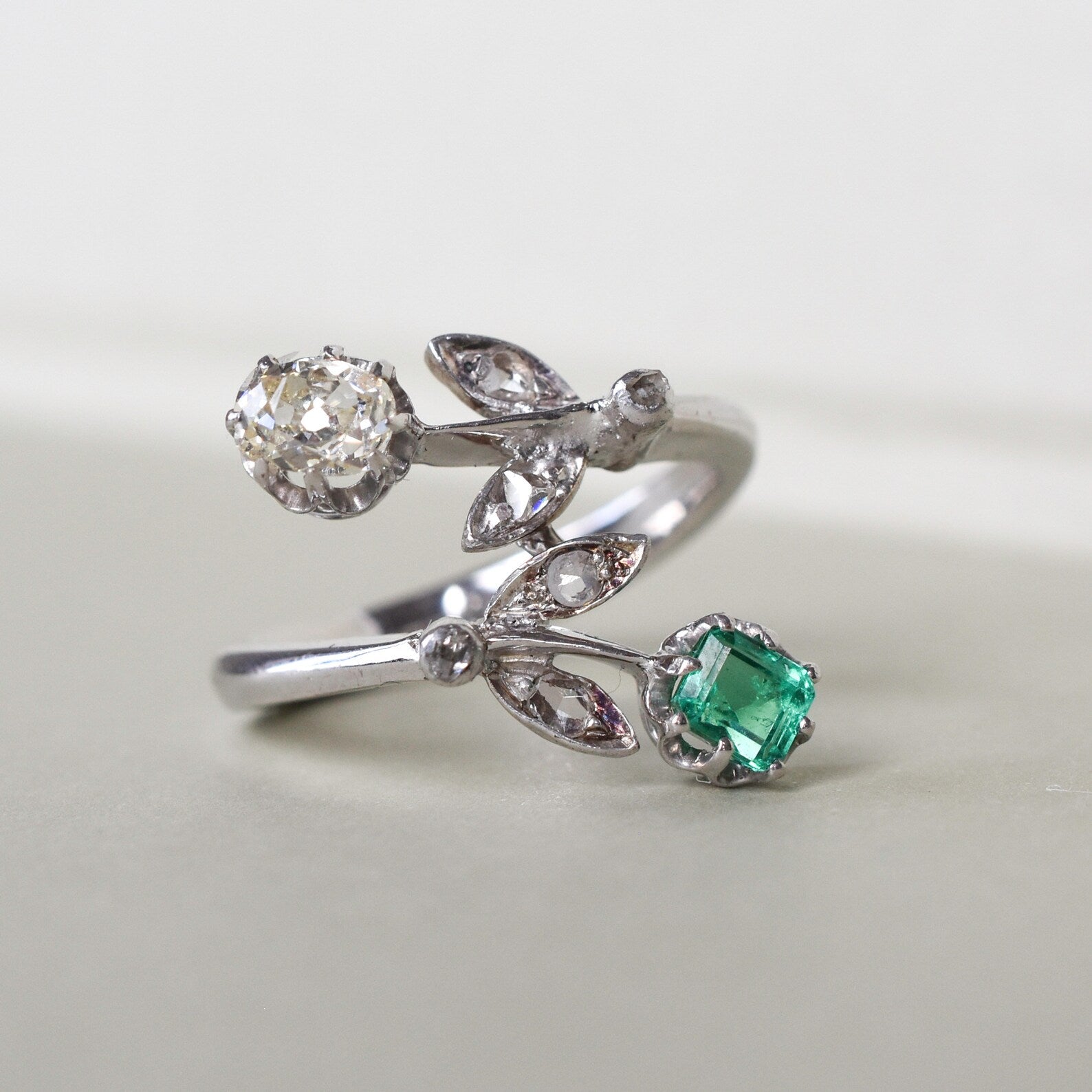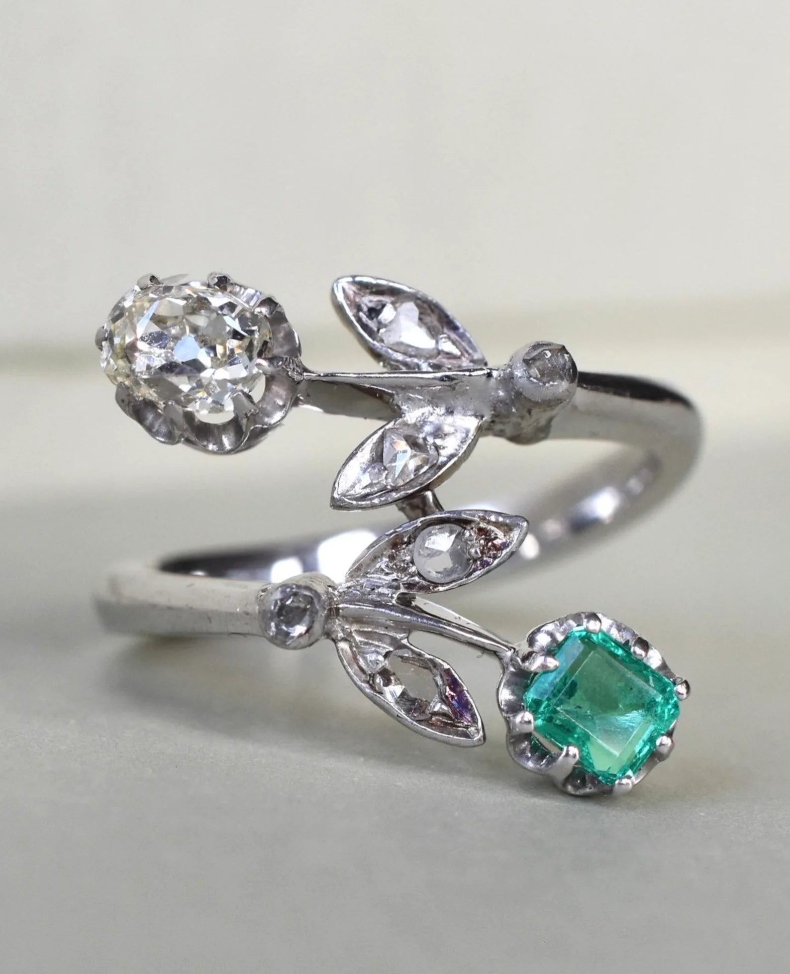 This striking vintage piece showcases a foliate design entirely crafted in 18k white gold, set with a 0.40ct natural step cut emerald stone holding a vivid bottle green hue and excellent clarity, paired with a chunky 0.50ct Old Mine Cut Diamond with a subtle warm undertone and SI clarity. The ring is further accented by Rose cut Diamonds on the leaves of the flowers. The ring is entirely crafted in solid 18k white gold and bears the stamp 750 on the inside band.
