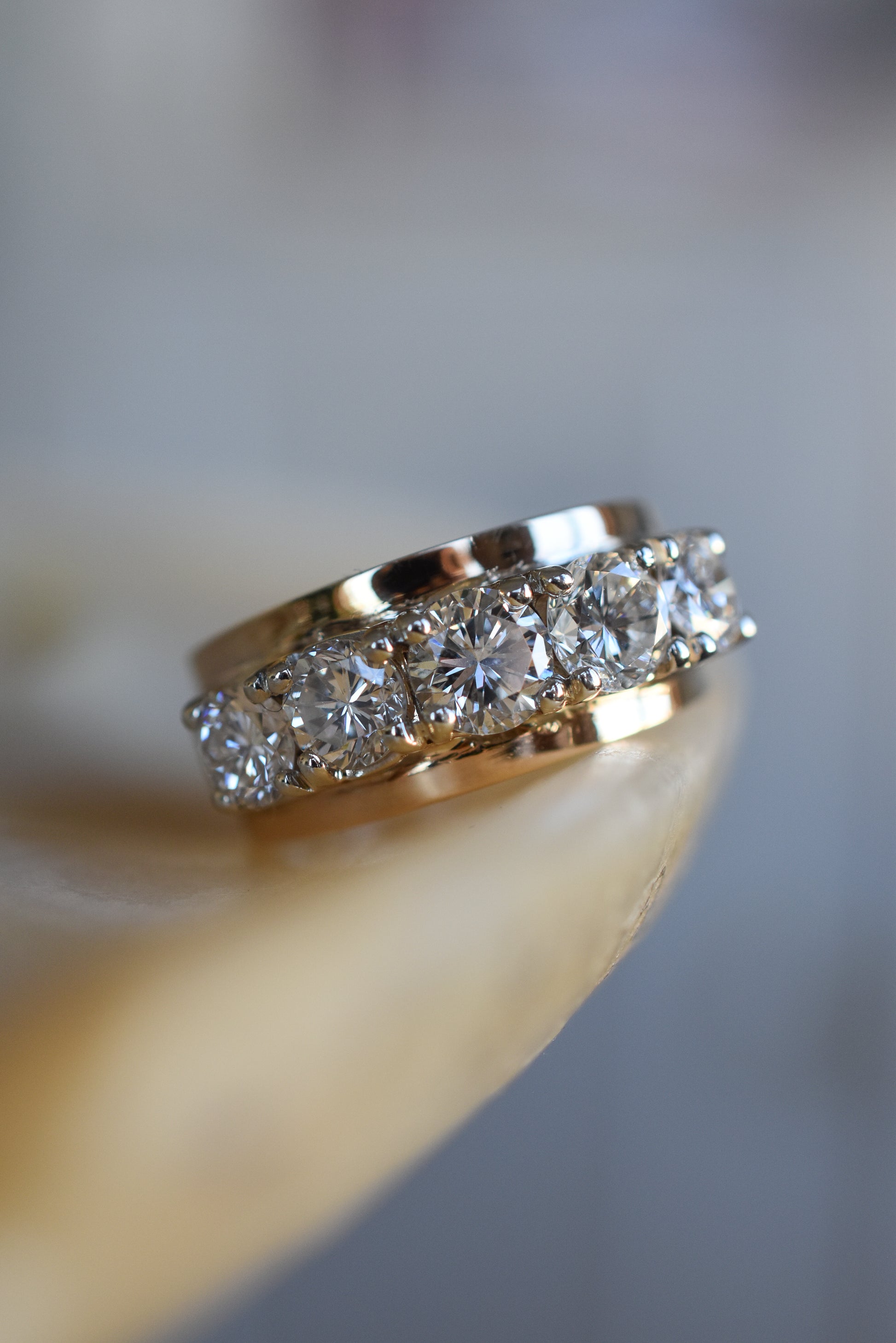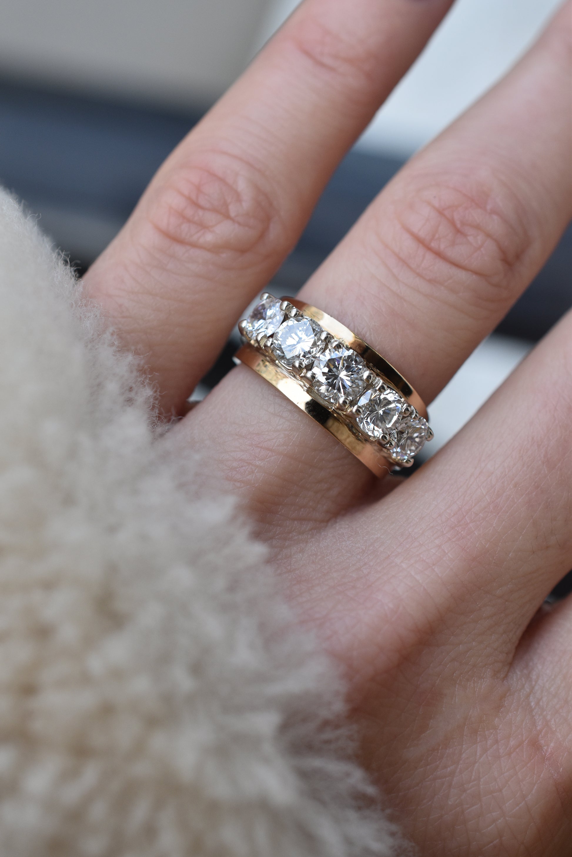 A spectacular Estate Five Stone Diamond Ring, claw-set with five brilliant-cut diamonds totalling 2.25 carats, estimated H-I colour and SI clarity and mounted onto a unique wide bicoloured gold band. The interior marked with a dedicatory inscription.