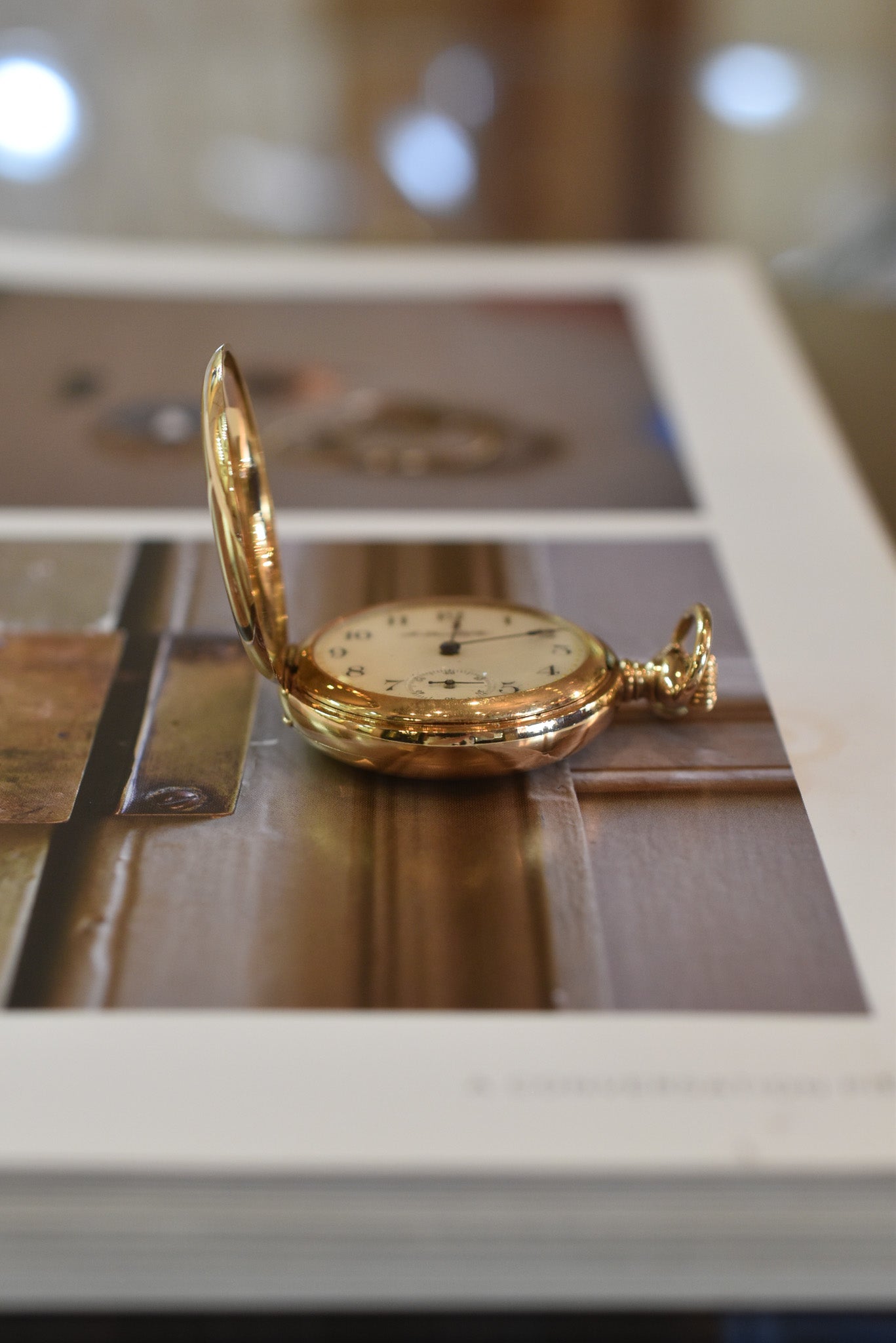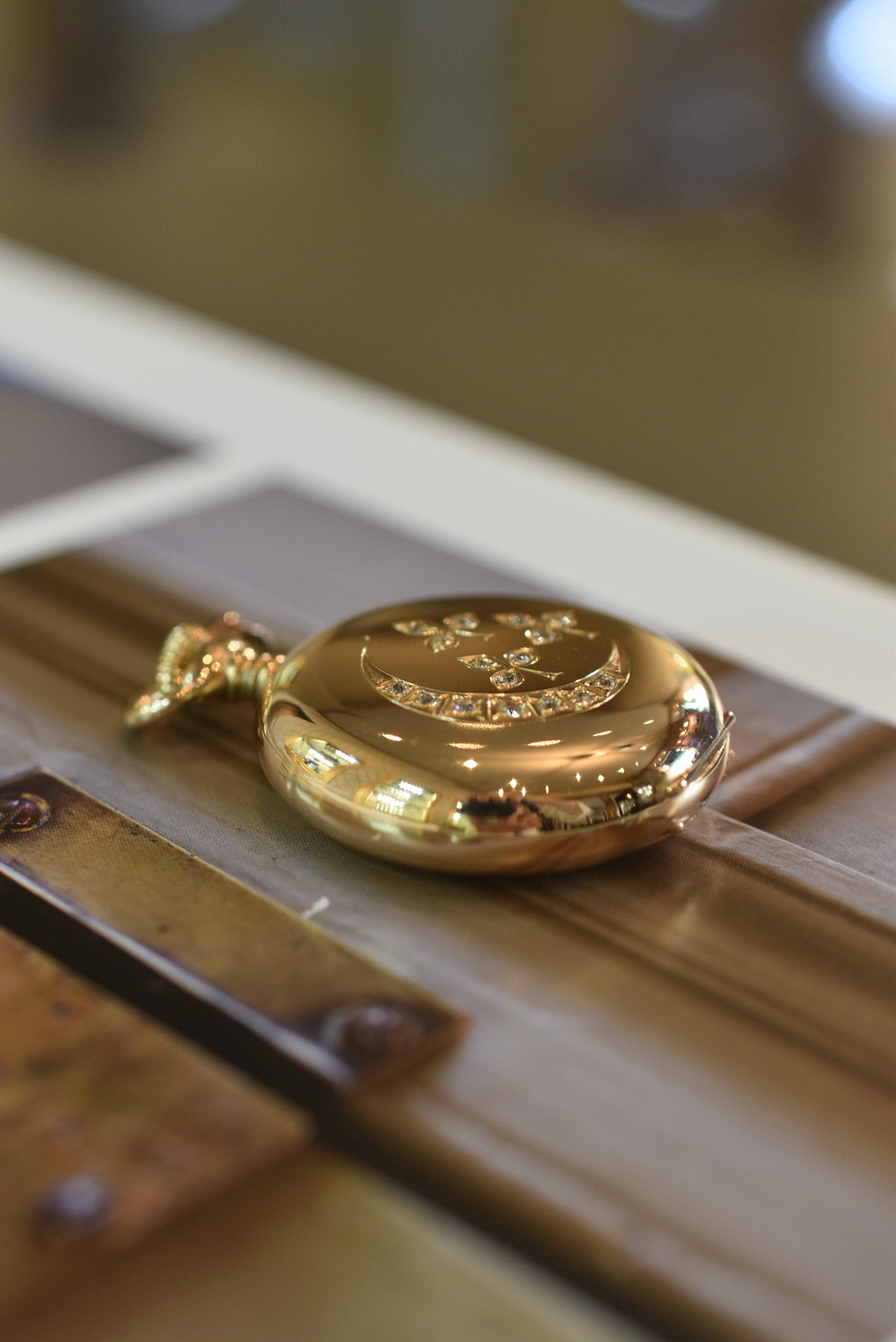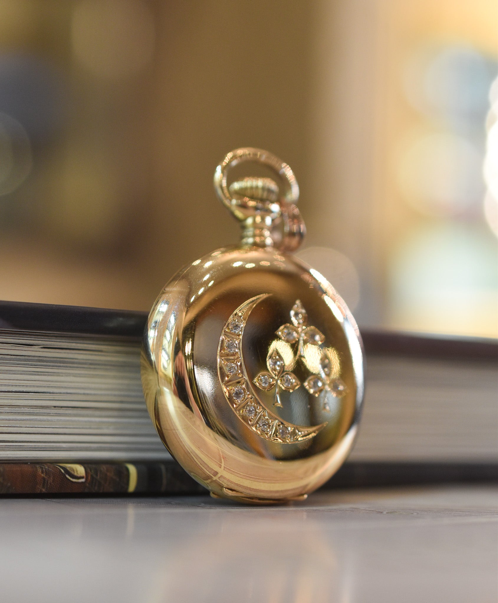 The face embellished with Old Mine Cut Diamonds forming a crescent moon and three clovers, for an estimated total weight of 0.35 carats. The 14ct gold case opens through the push button to an immaculate watch with champagne dial. The watch is fully functioning.
