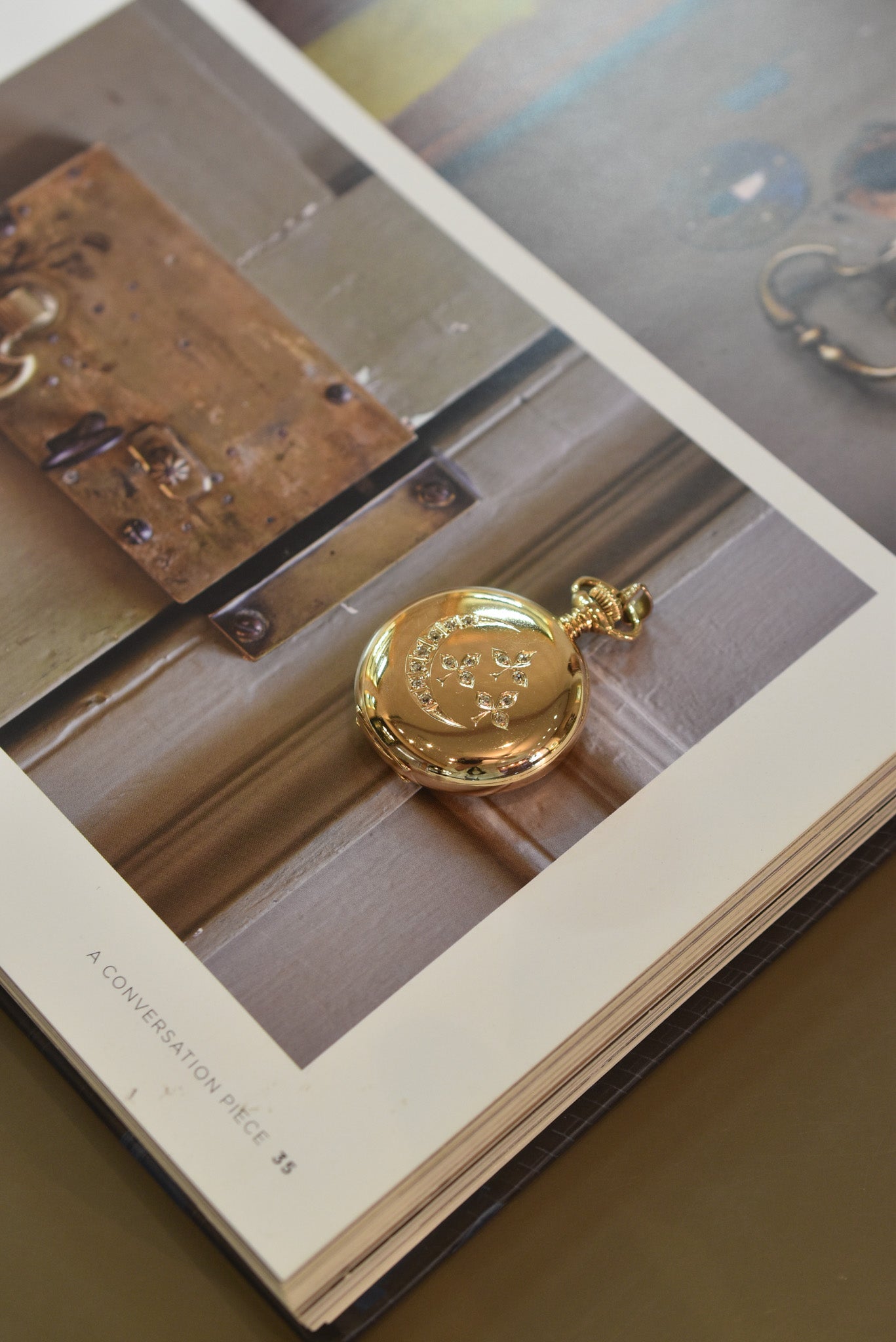 Antique Diamond Crescent Moon & Clover 14k Gold Pendant / Pocket Watch (37 grams)