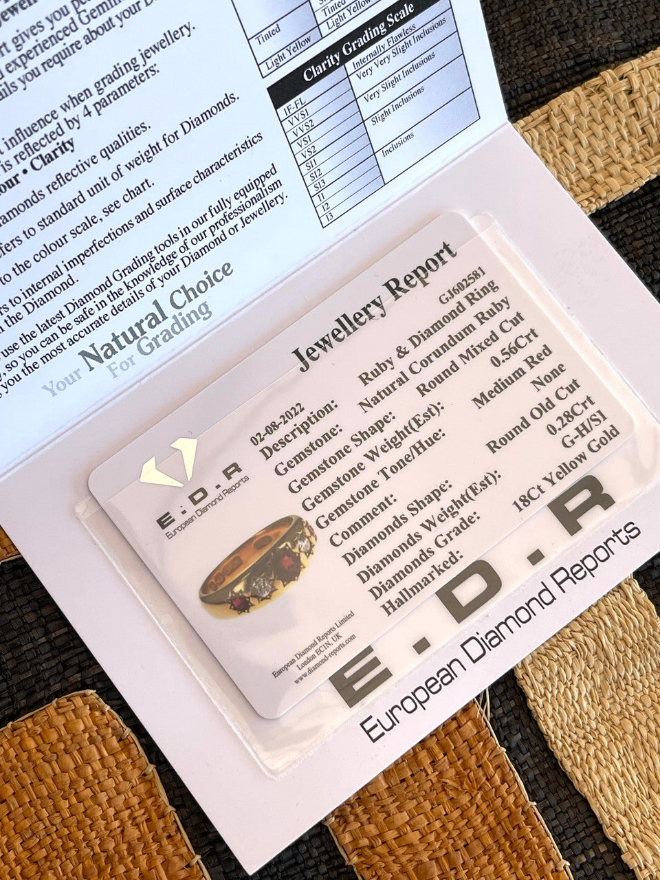 This showstopper showcases three vivid purplish-red rubies (the central one measuring 5 x 5 x 3mm and the outers 3 x 3mm) estimated at approximately 0.56t in total, alternated by two sparkly old cut diamonds for an estimated 0.28ct (G-H colour, SI clarity). Entirely crafted in 18k yellow gold, the ring weights a luxurious 7.8 grams and is 7mm wide on the upper part and 4mm wide on the lower part of the shank.