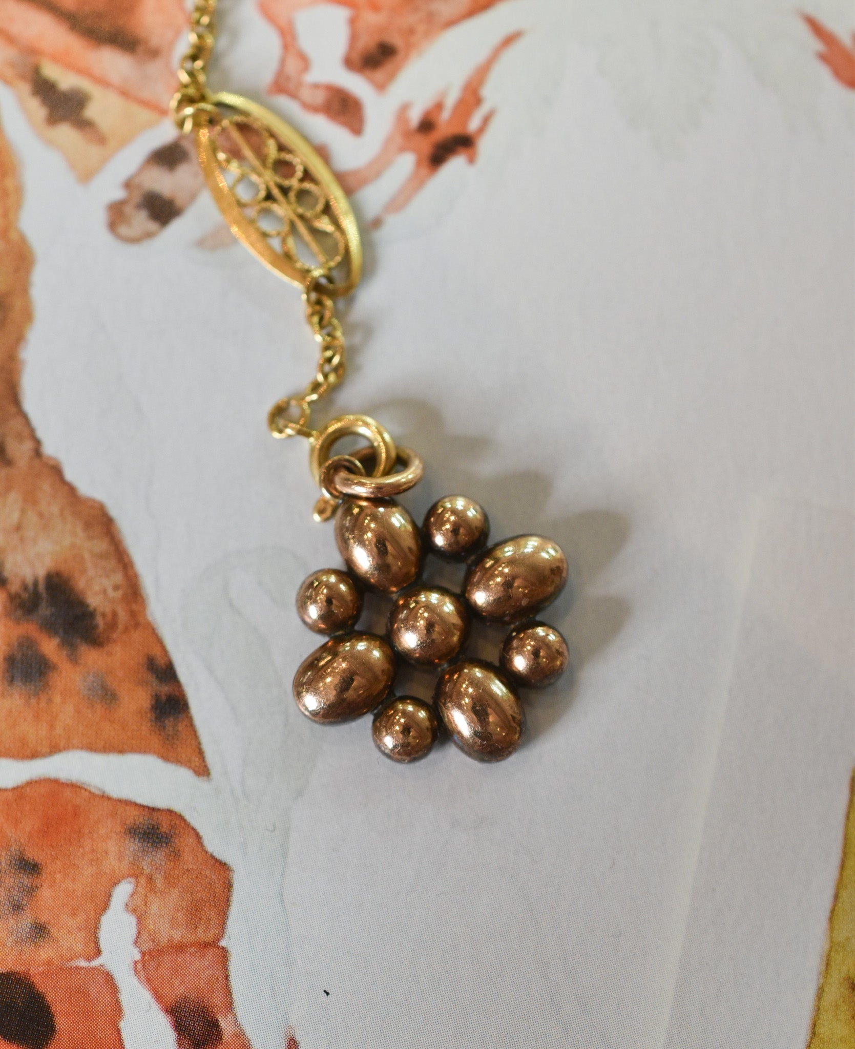 A stunning antique flat cut garnet flower charm/ pendant showcasing juicy foiled flat cut garnets with rosy 9k gold closed back settings. The pendant would rock either paired with a black velvet string or with your everyday gold chain.