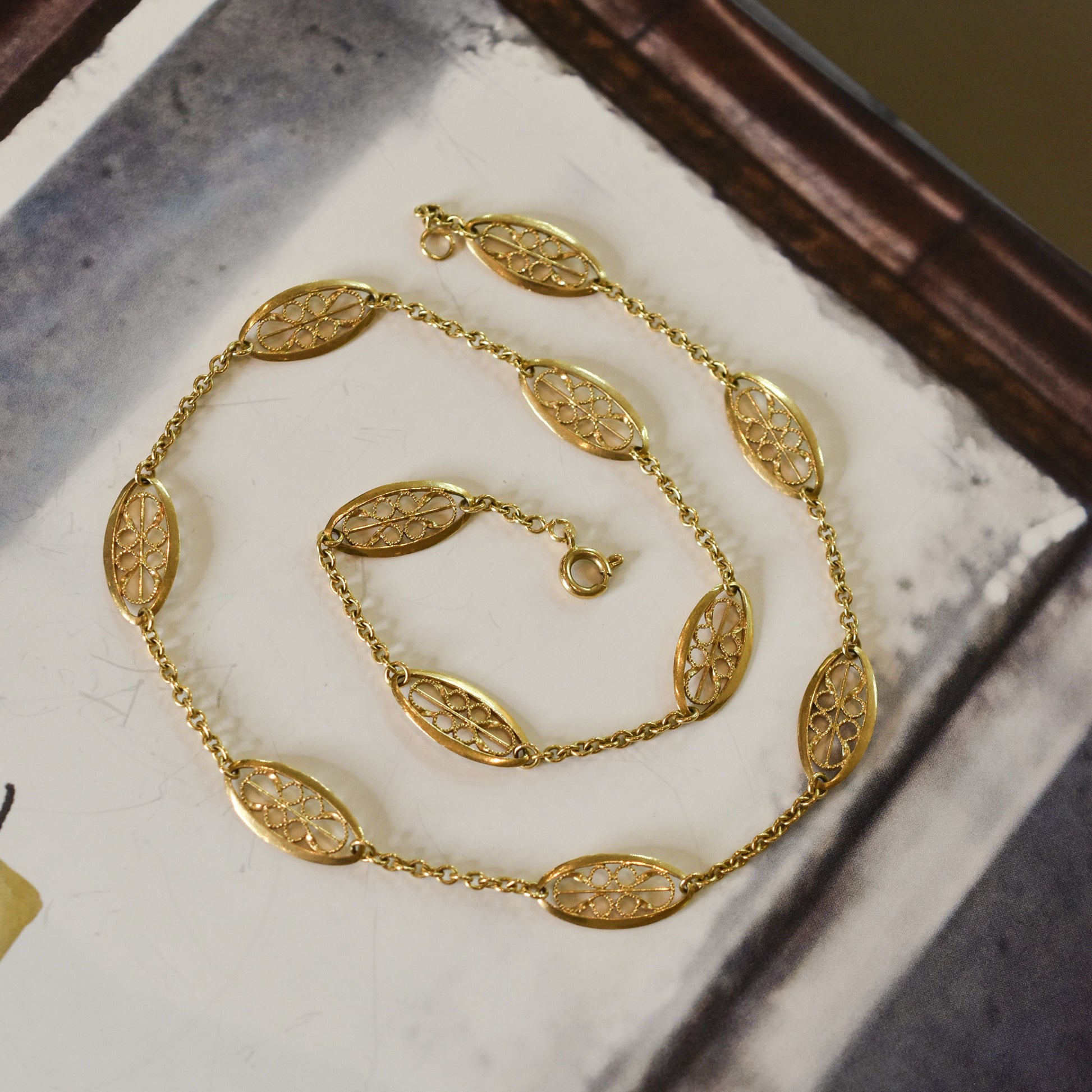 An elegant Antique French Filigree Chain Necklace handcrafted in high carat gold. The chain measures 41.5cm in length falling gracefully upon the collarbone with an overall gross weight of 10.2 grams. A high quality chain which can be worn daily on its own or stacked with other longer chains, as well as paired with charms or pendants (as shown in the last pictures).