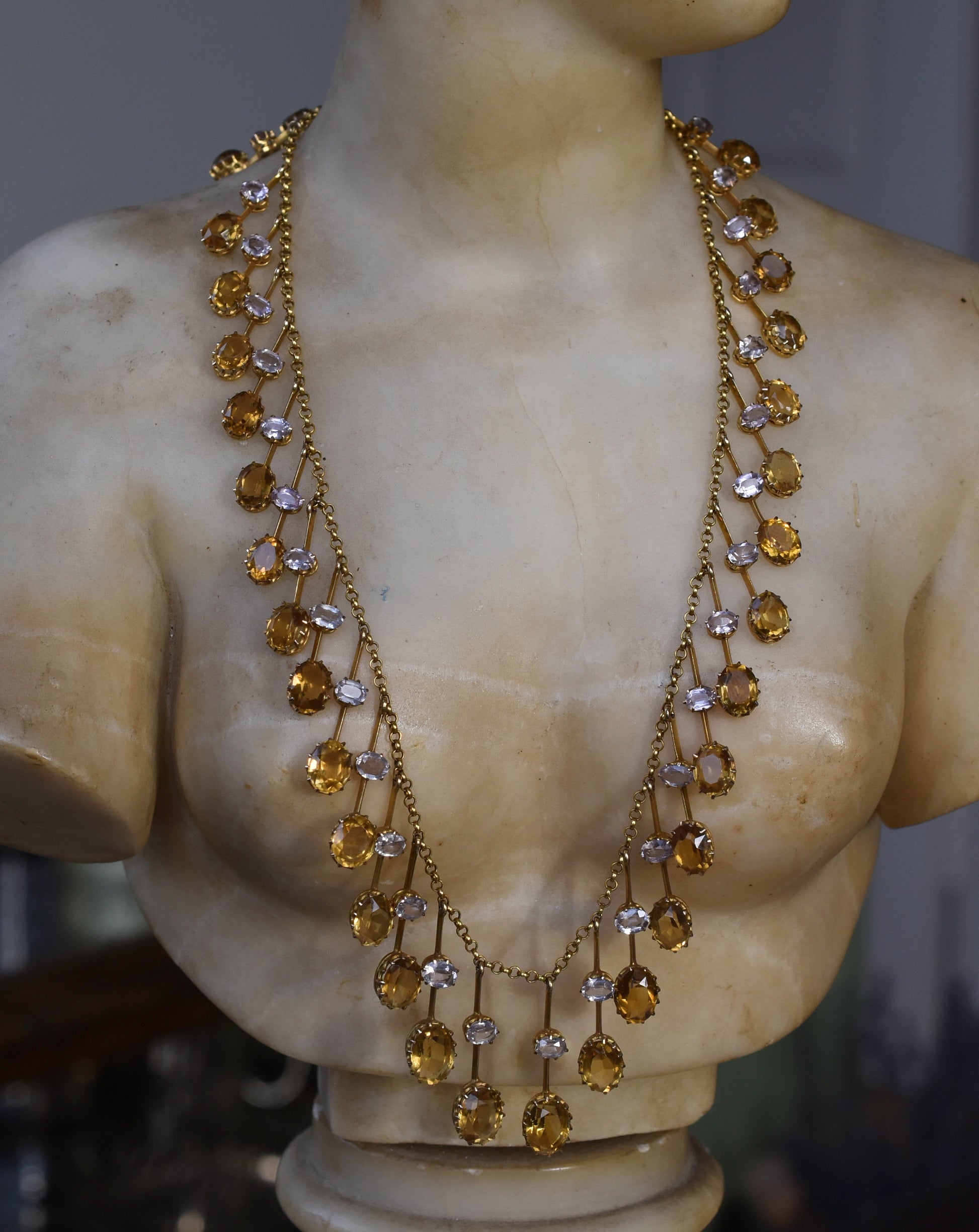 An outstanding Citrine and Topaz Fringe Necklace dating back to the late Victorian Era/ Beginning of the 20th Century, set with thirty-three graduated fringes each set with an Oval Cut Pink Topaz with light pink hue (almost colourless) and an Oval Cut Citrine with deep medium brownish yellow hue. The gemstones are nestled within a crown style setting crafted in 15ct yellow gold and suspended from a roll chain.