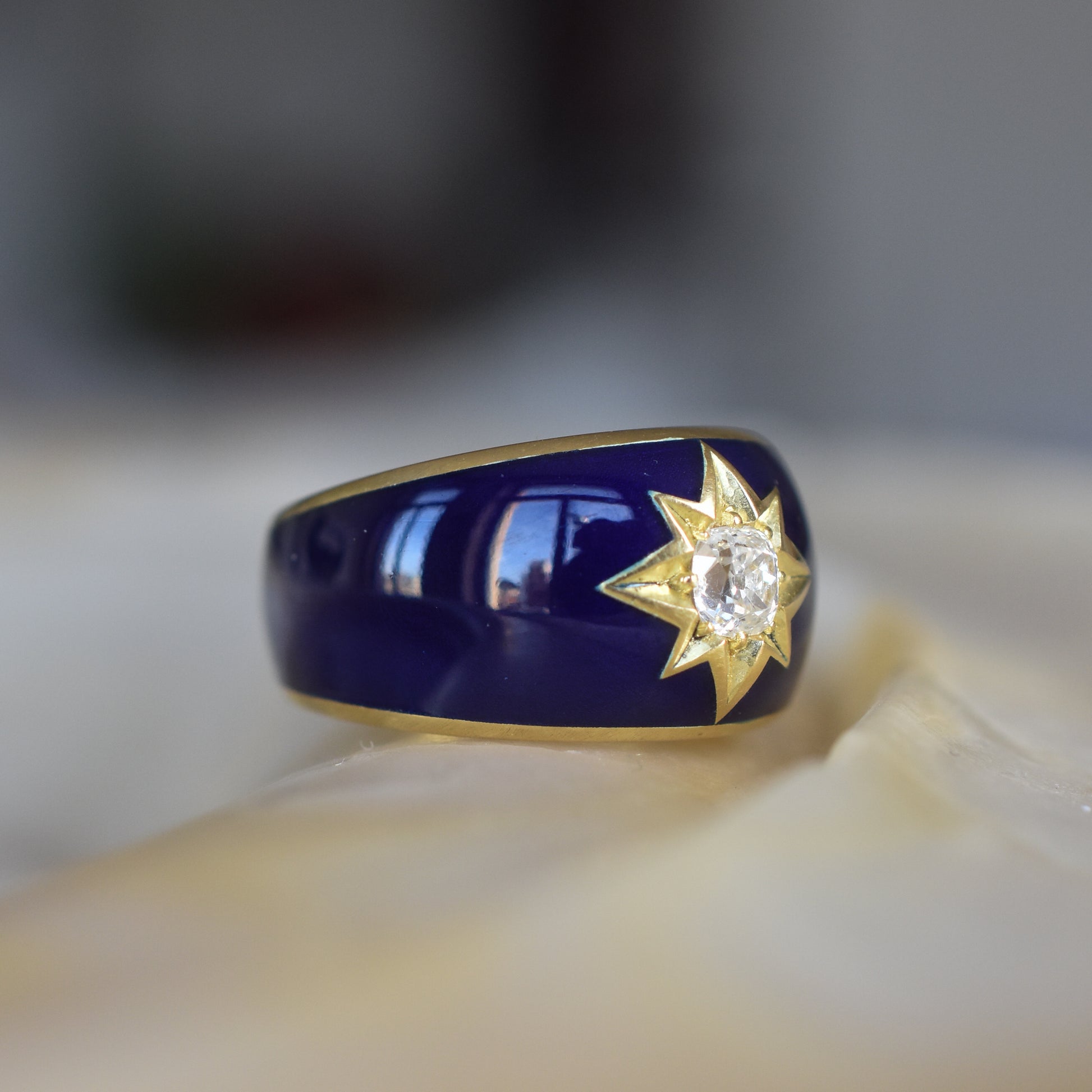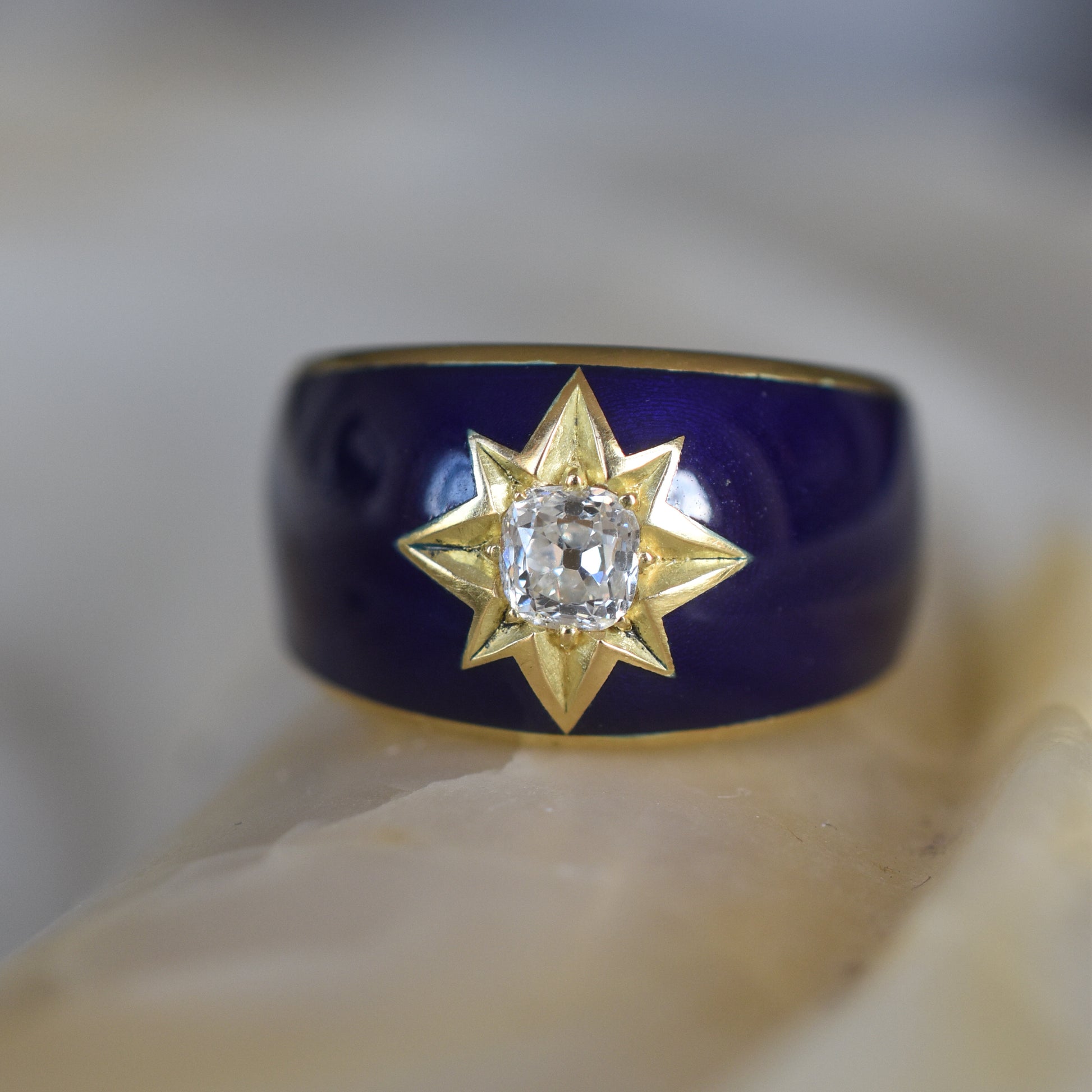 Old Mine cut Diamond and Blue Enamel Celestial ‘Star’ Ring in 18k Yellow Gold