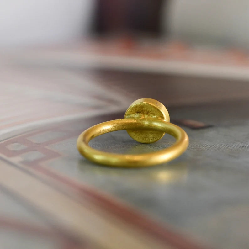 This exquisite Diamond Solitaire Ring showcases a lively rose-cut diamond measuring 6 x 6mm, estimated at 0.75ct, VS clarity and E-F colour by E.D.R Lab in London. The Diamond is collet-set within a black enamel surround to a 22ct solid yellow gold chunky shank. The gold has been both acid and gun tested in Lab, resulting in 22CT gold purity.