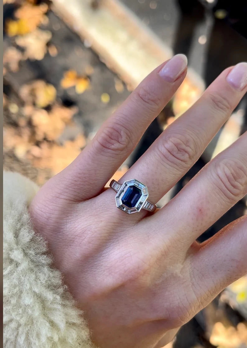 The ring is collet-set with a cut-cornered rectangular Natural Step-cut Sapphire weighting 1.58ct of medium blue colour, showing signs of heat treatment. The Sapphire is set within a baguette-cut diamond surround for a total 0.76ct, estimated F-G colour and VS clarity. The ring is entirely crafted in Platinum, and bears Hallmarks on the inside shank.