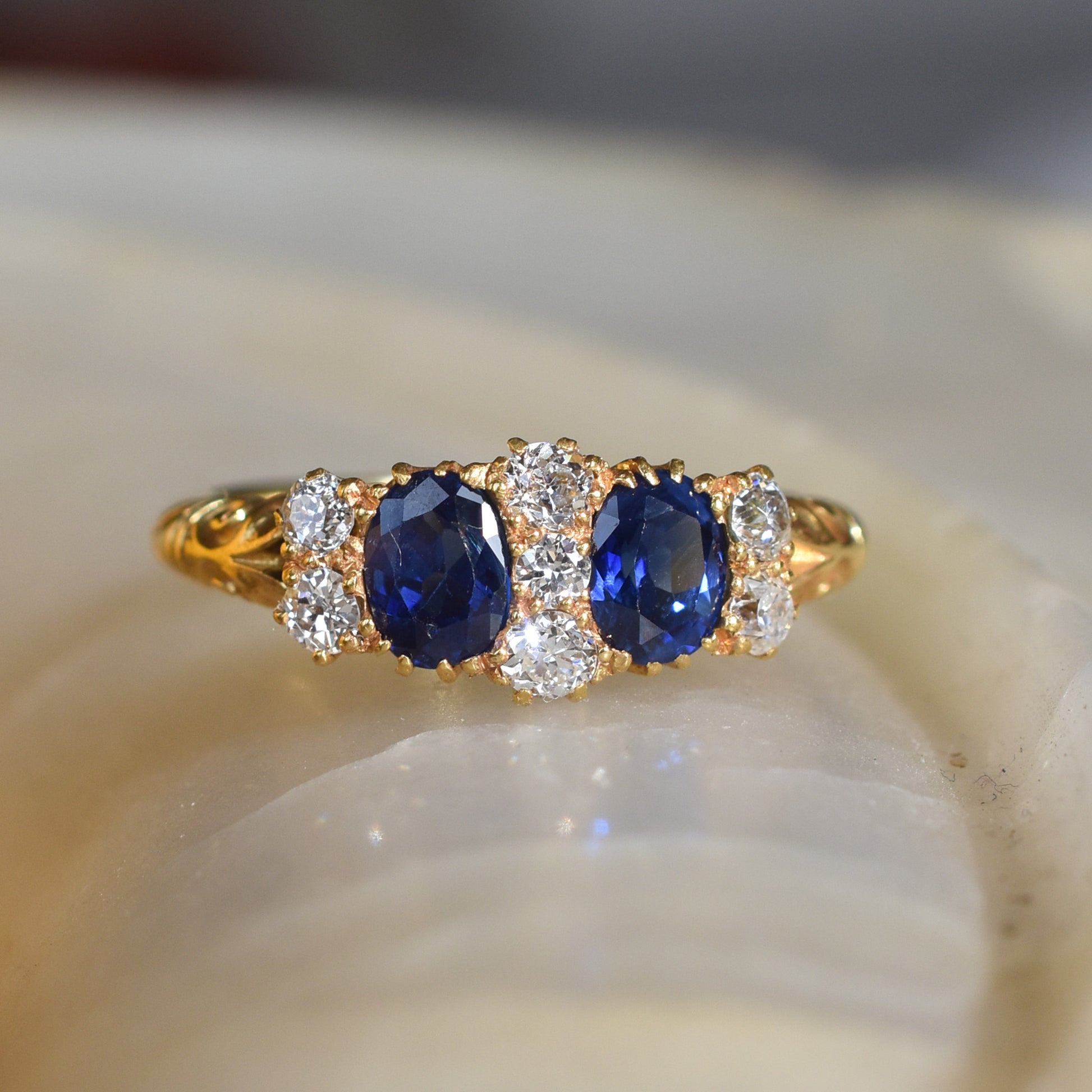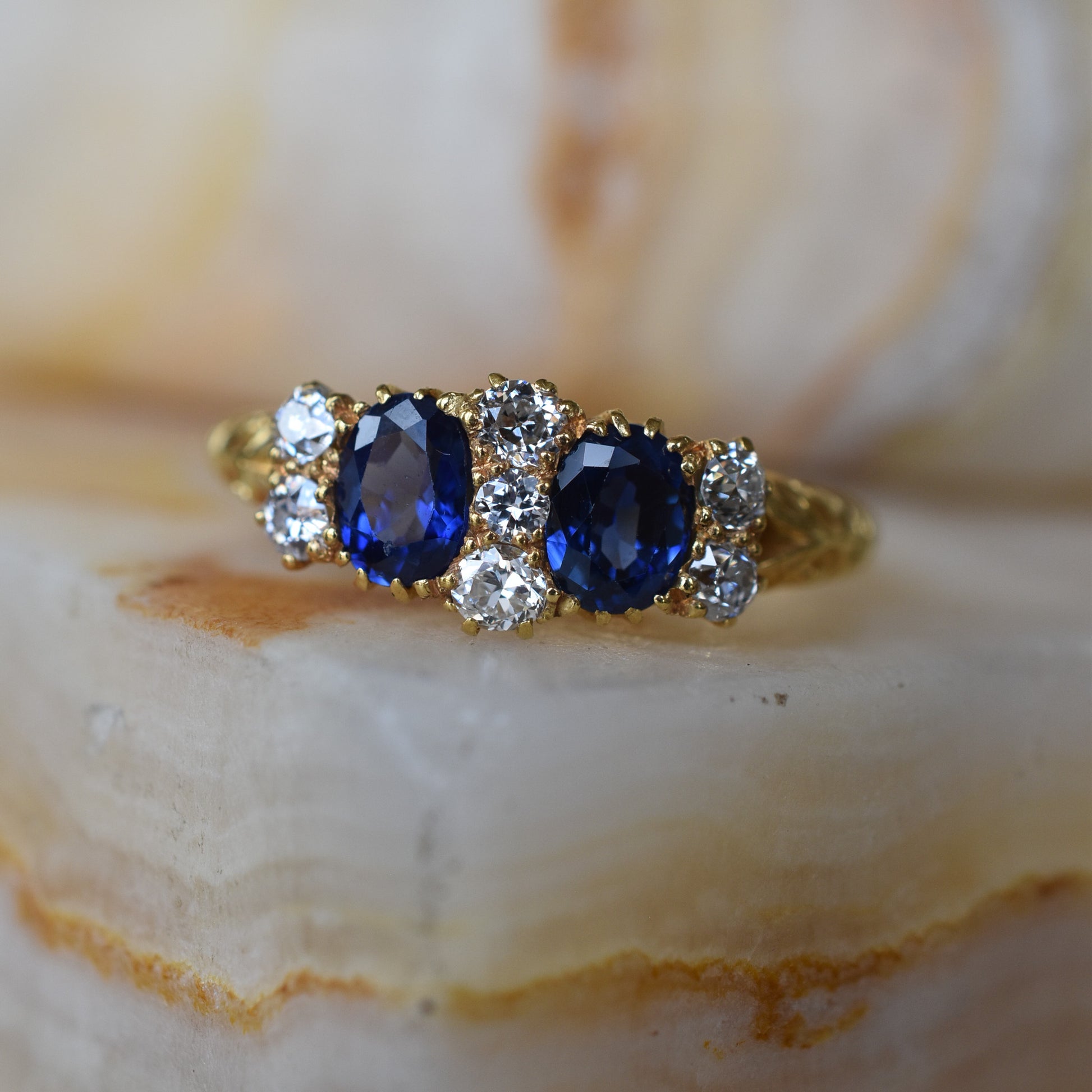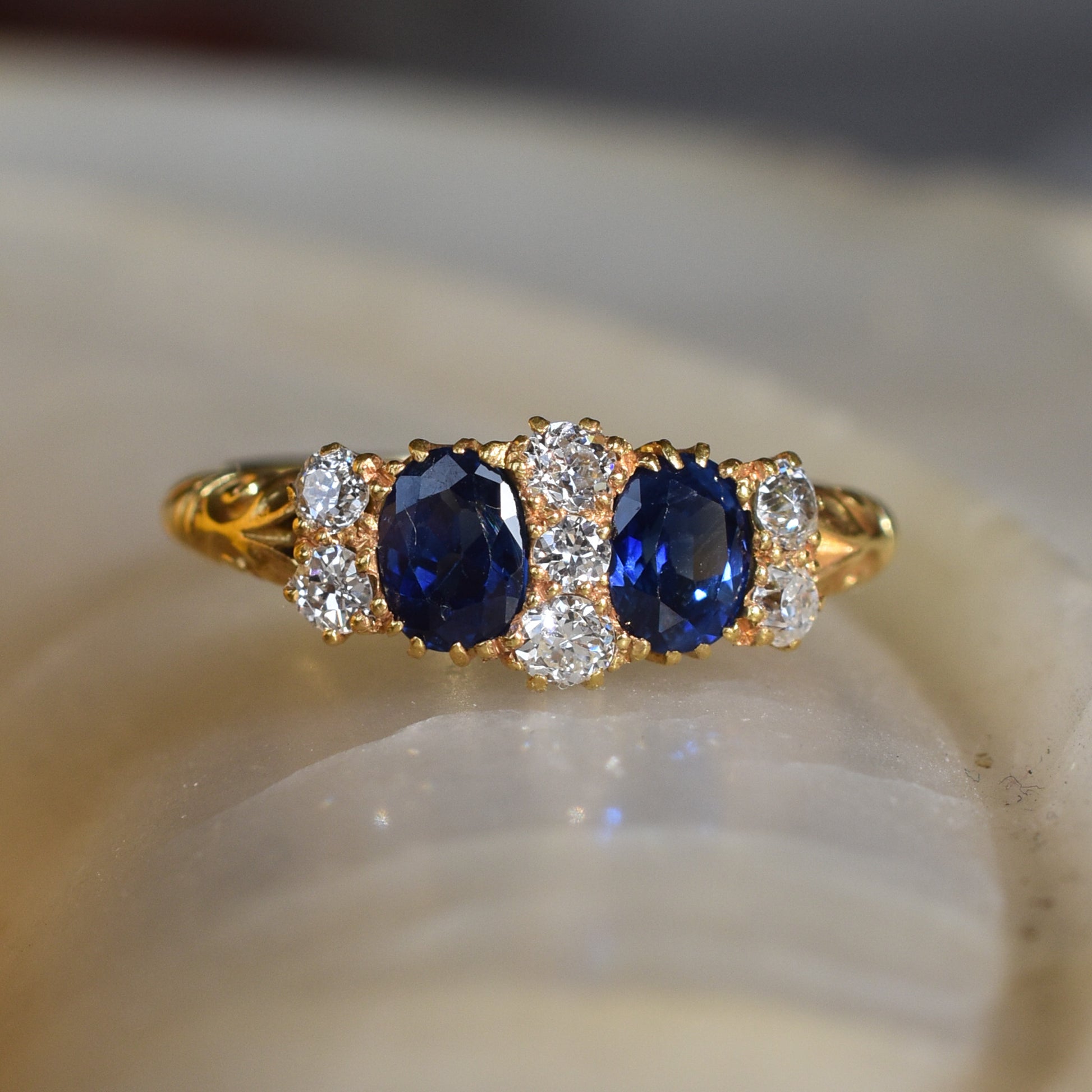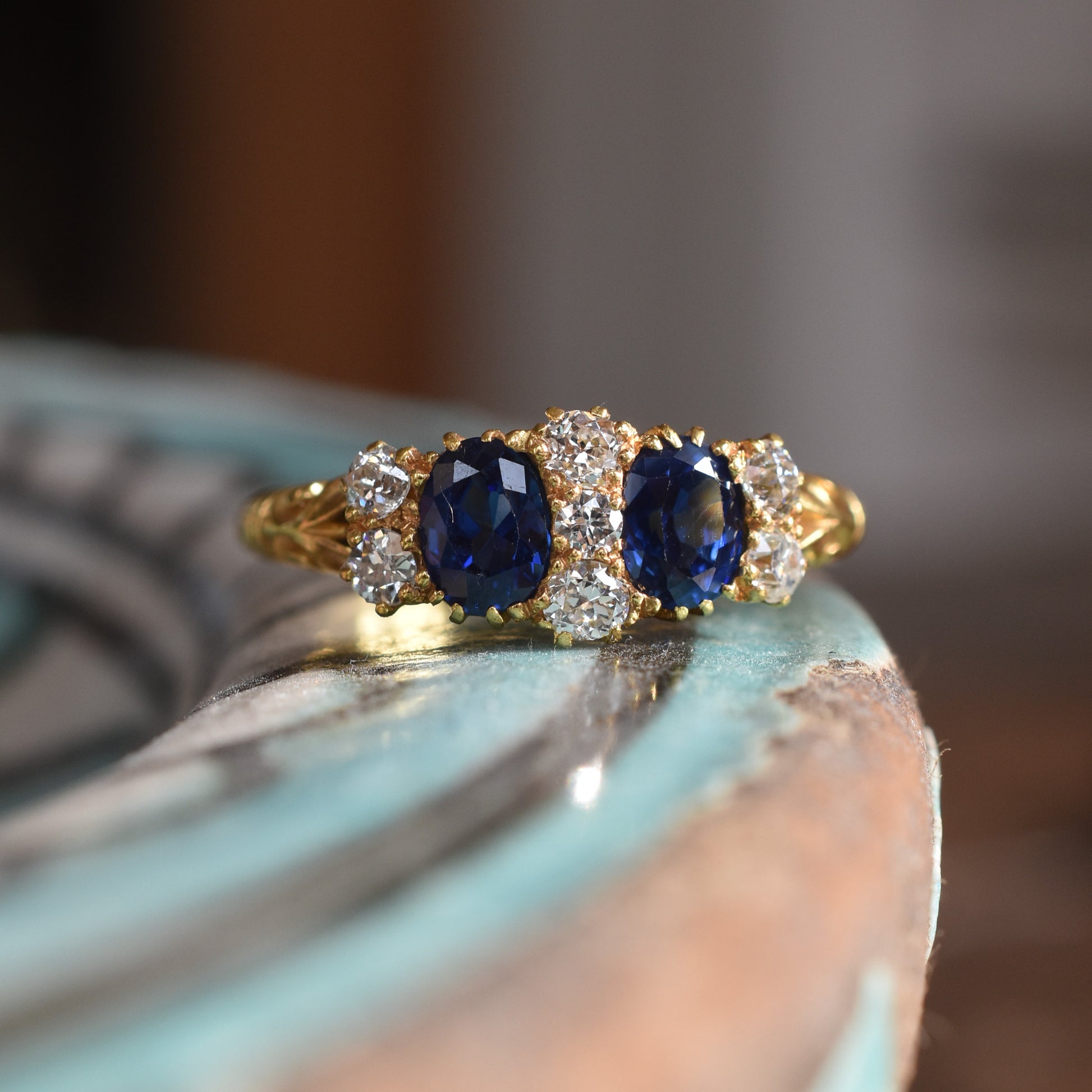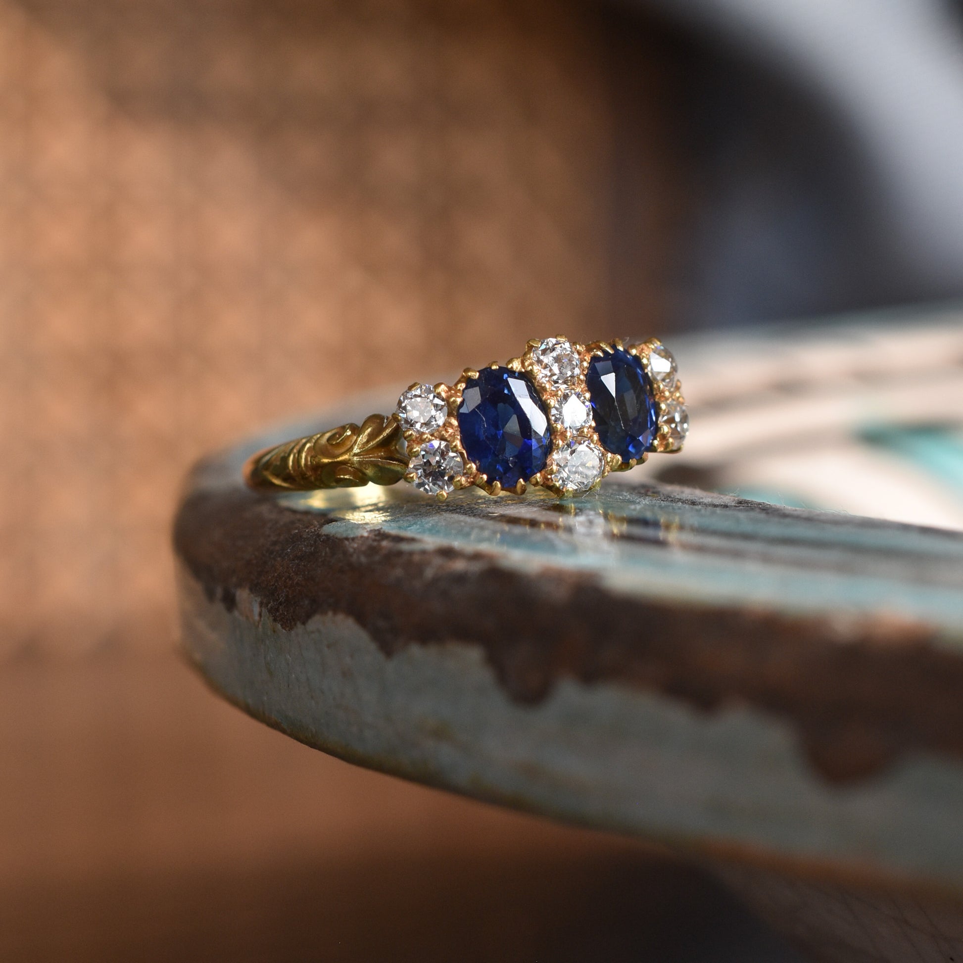 An elegant and finely crafted Antique / Victorian Style Sapphire and Diamond ring mounted on 18k Yellow Gold, showcasing two natural oval mixed cut Royal Blue Sapphires of excellent colour and clarity estimated at 1.10 carats in total. The gemstones are framed by seven old cut diamonds, estimated at 0.40 carats, G-H Colour and SI clarity. The shoulders are decorated on either side with a scalloped design. The ring will be accompanied by a Full Jewellery Report issued by E.D.R. Lab in London.