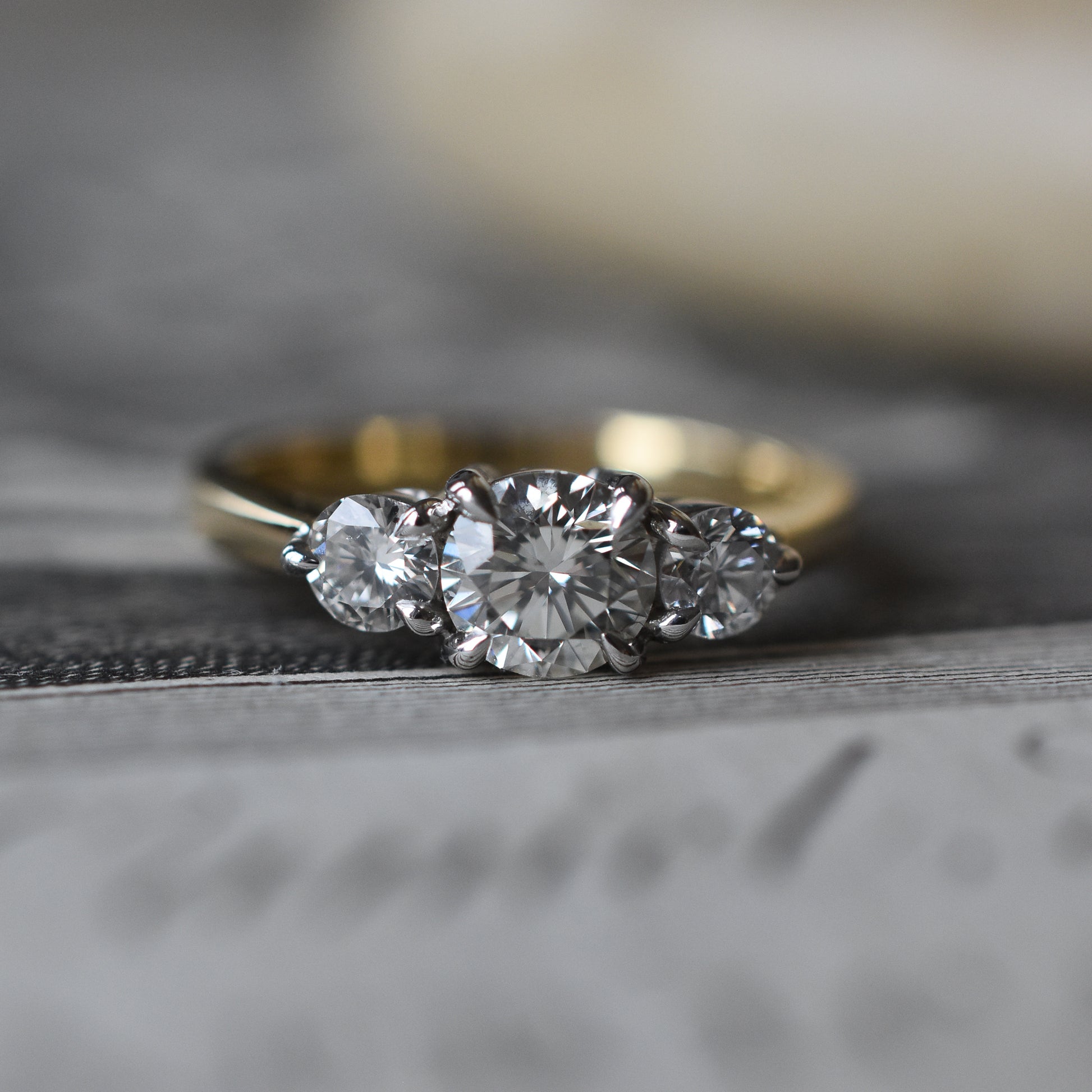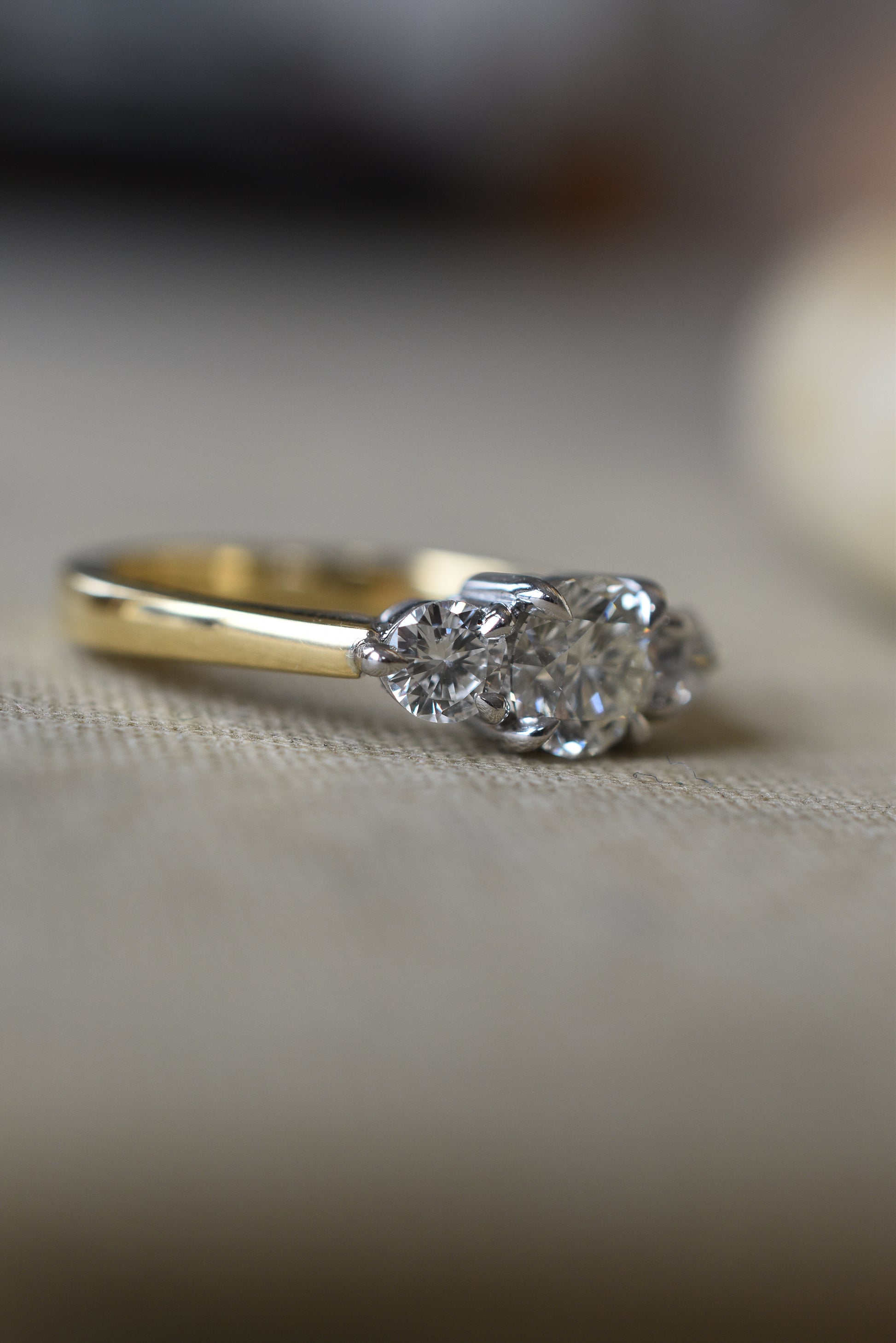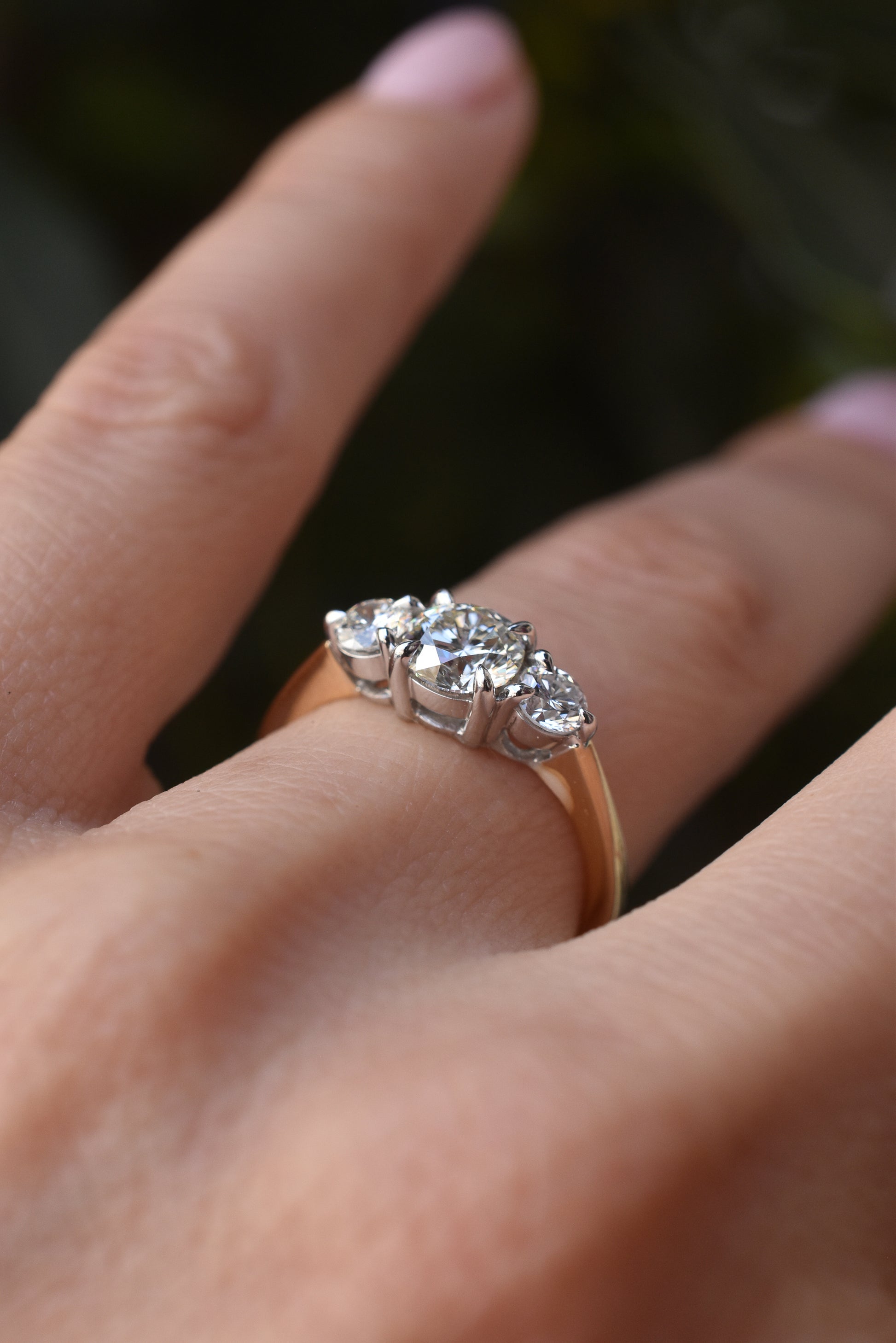 An elegant Vintage Trilogy Diamond Engagement Ring mounted in 18k yellow gold, showcasing a total of 1.15 carats of dazzling diamonds, each certified by EDR in London.