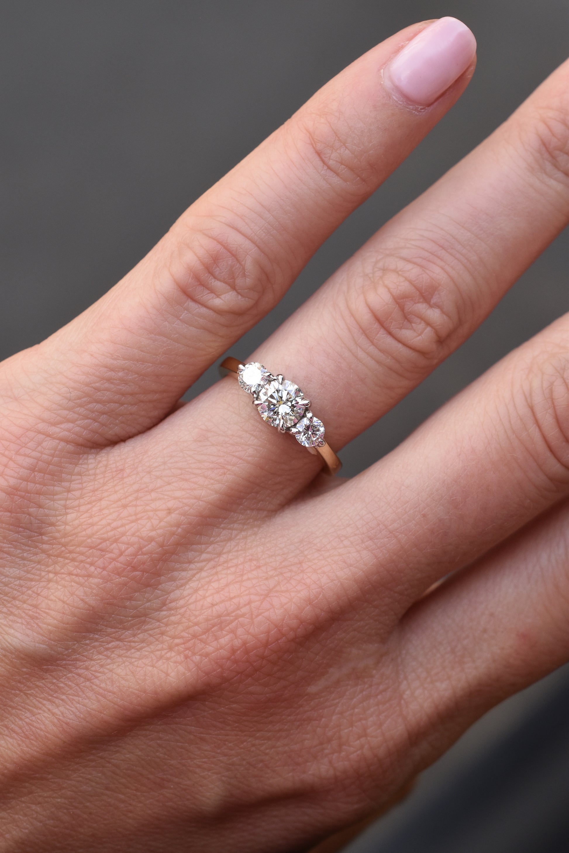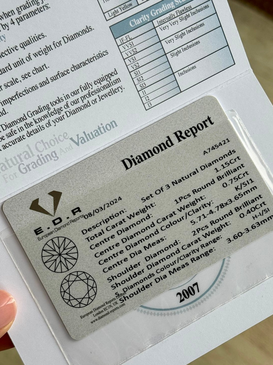 The ring features a central 0.75ct brilliant-cut diamond with a K colour and SI1 clarity, flanked by two side diamonds totalling 0.40ct, each H-I colour and SI clarity. All diamonds are radiating with exceptional brilliance and are absolutely eye clean.