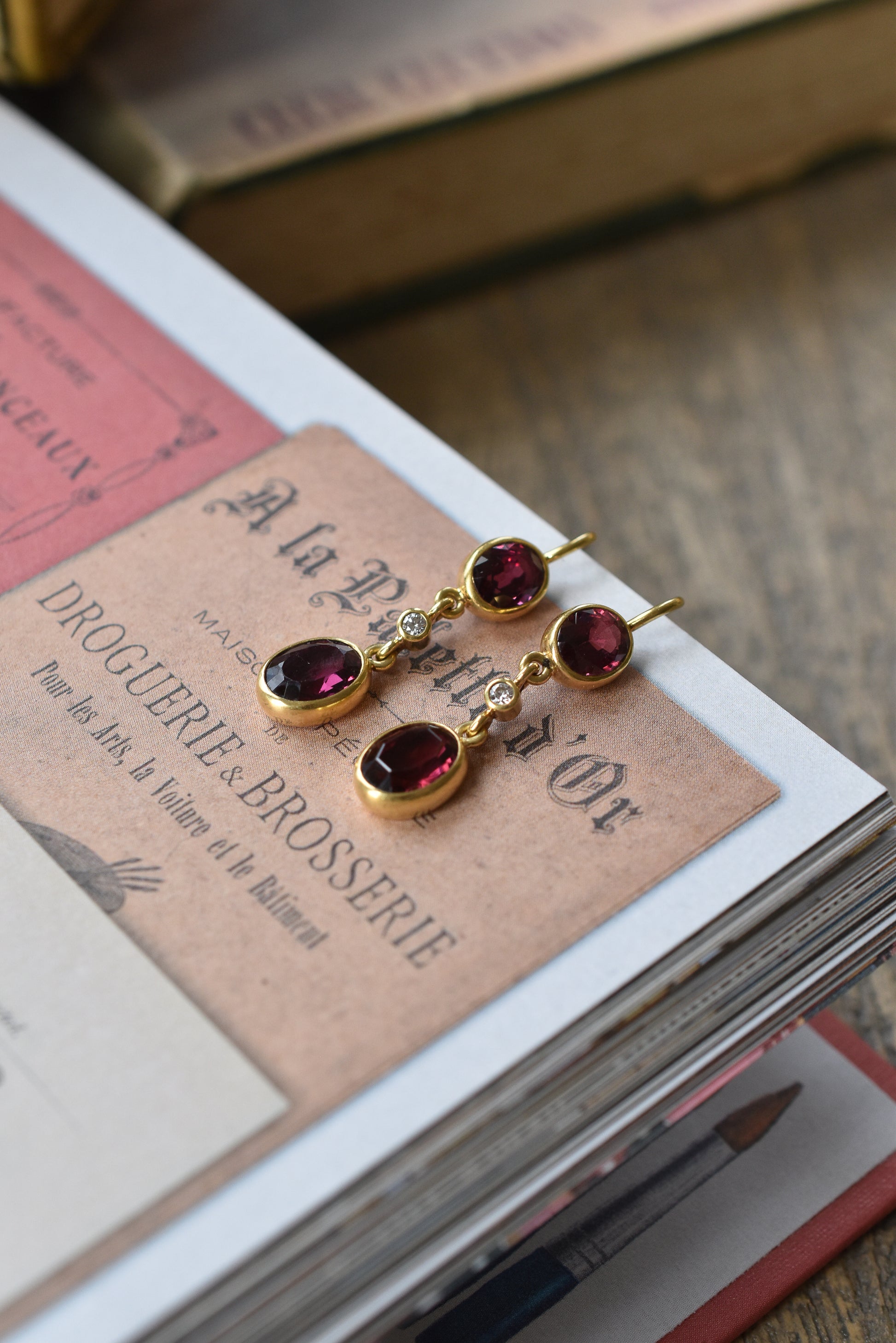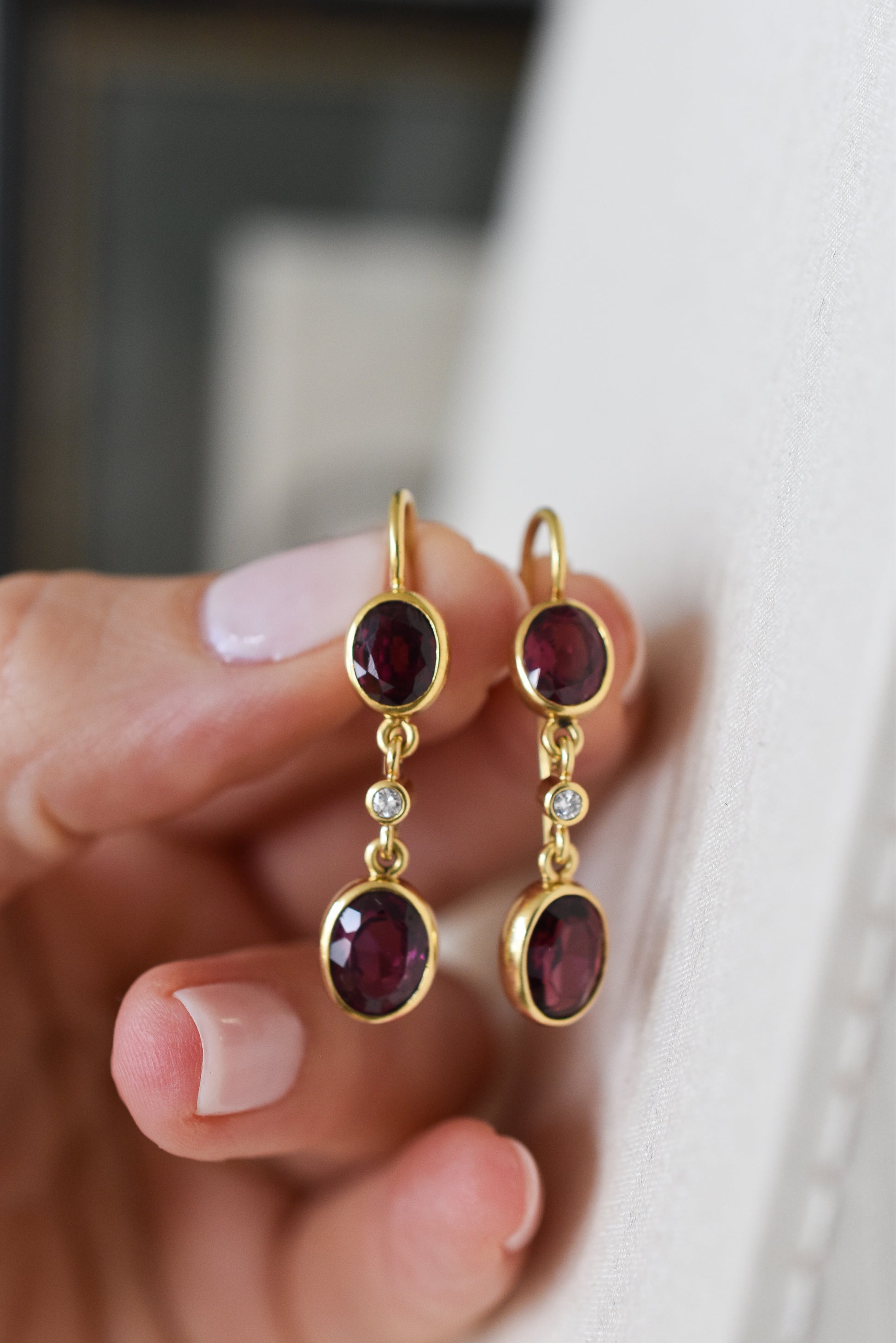 Vintage 18k Gold Garnet and Diamond Dangle Earrings (6.50 grams)