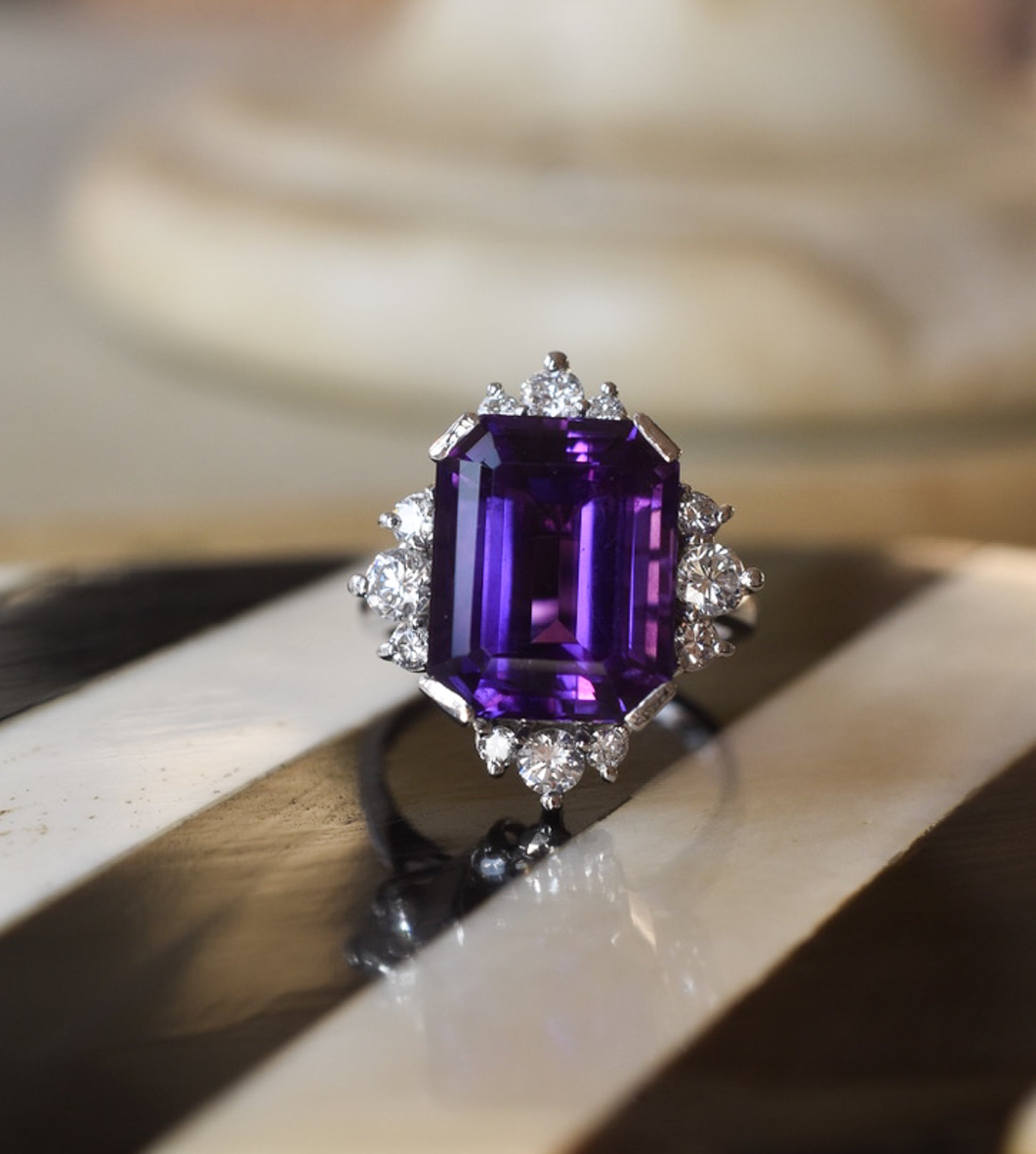 An elegant Amethyst and Diamond Statement Ring, featuring a large step-cut amethyst set within graduated circular-cut diamonds mounted in 18k white gold. The ring bears London hallmarks for 1976 and is currently a UK size J, US size 5. Please get in touch prior to sale to arrange a resizing!