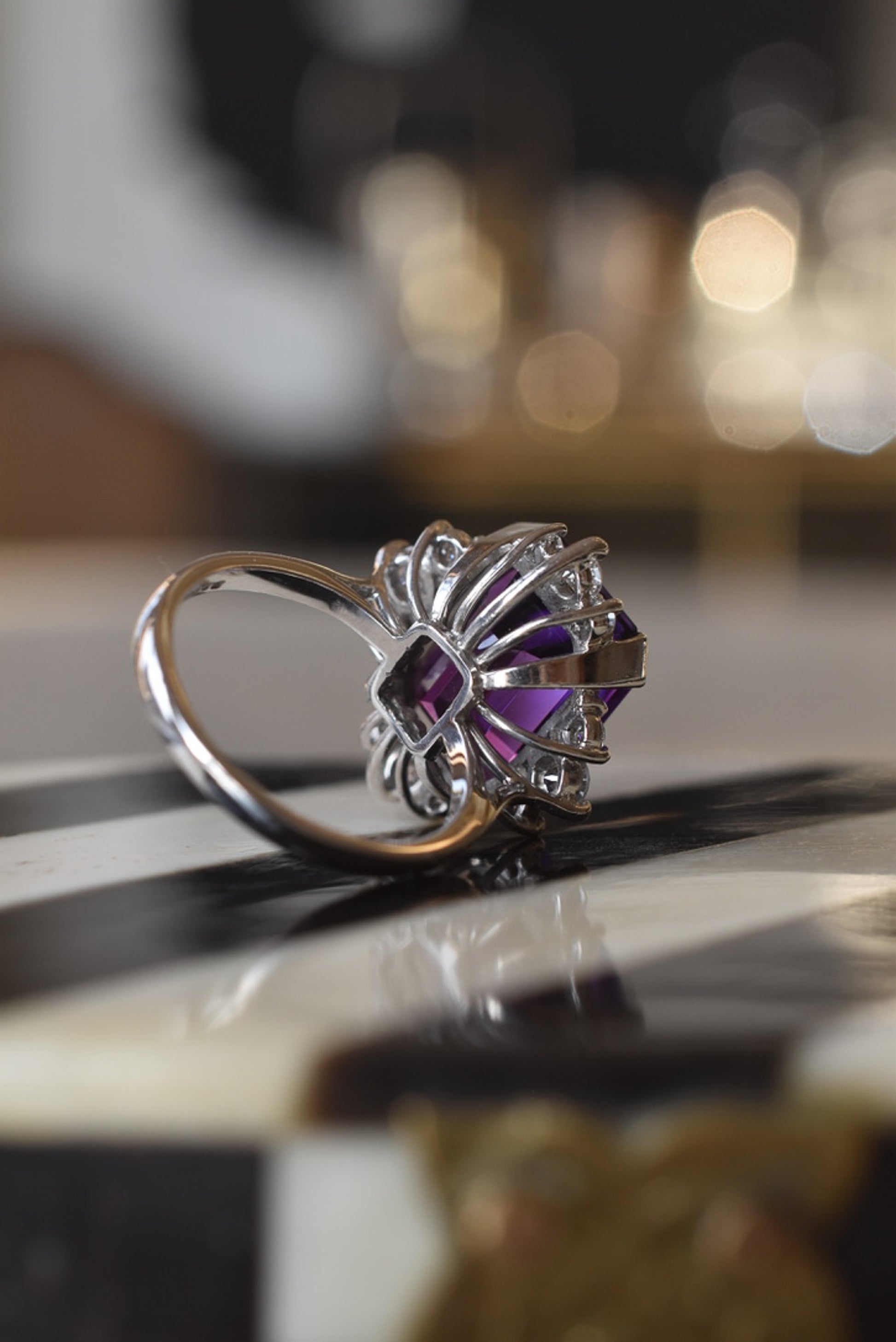 Vintage 1970s Amethyst and Diamond Cocktail Ring in 18k White Gold