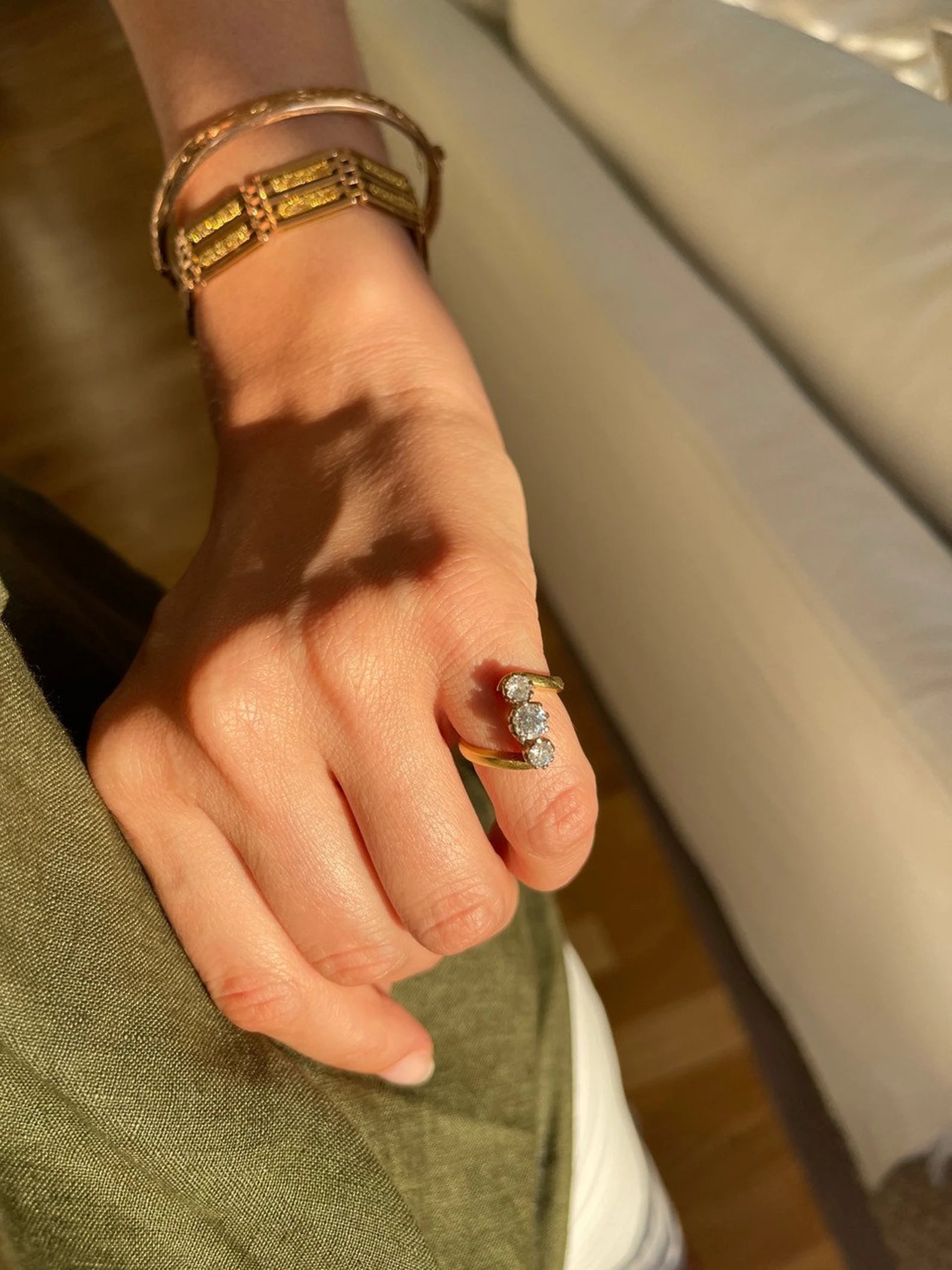 With an elegant presence on the hand and nice weight of 4.85 grams, this English Three Stone Diamond ring would make the ideal pinky or statement ring. The ring sits comfortably 4mm above the finger and currently fits a UK size E, US 2 1/2. It can be easily adjusted to fit your size. I am happy to offer a resizing service by goldsmith for an additional fee of £55 (lead time 7 business days).