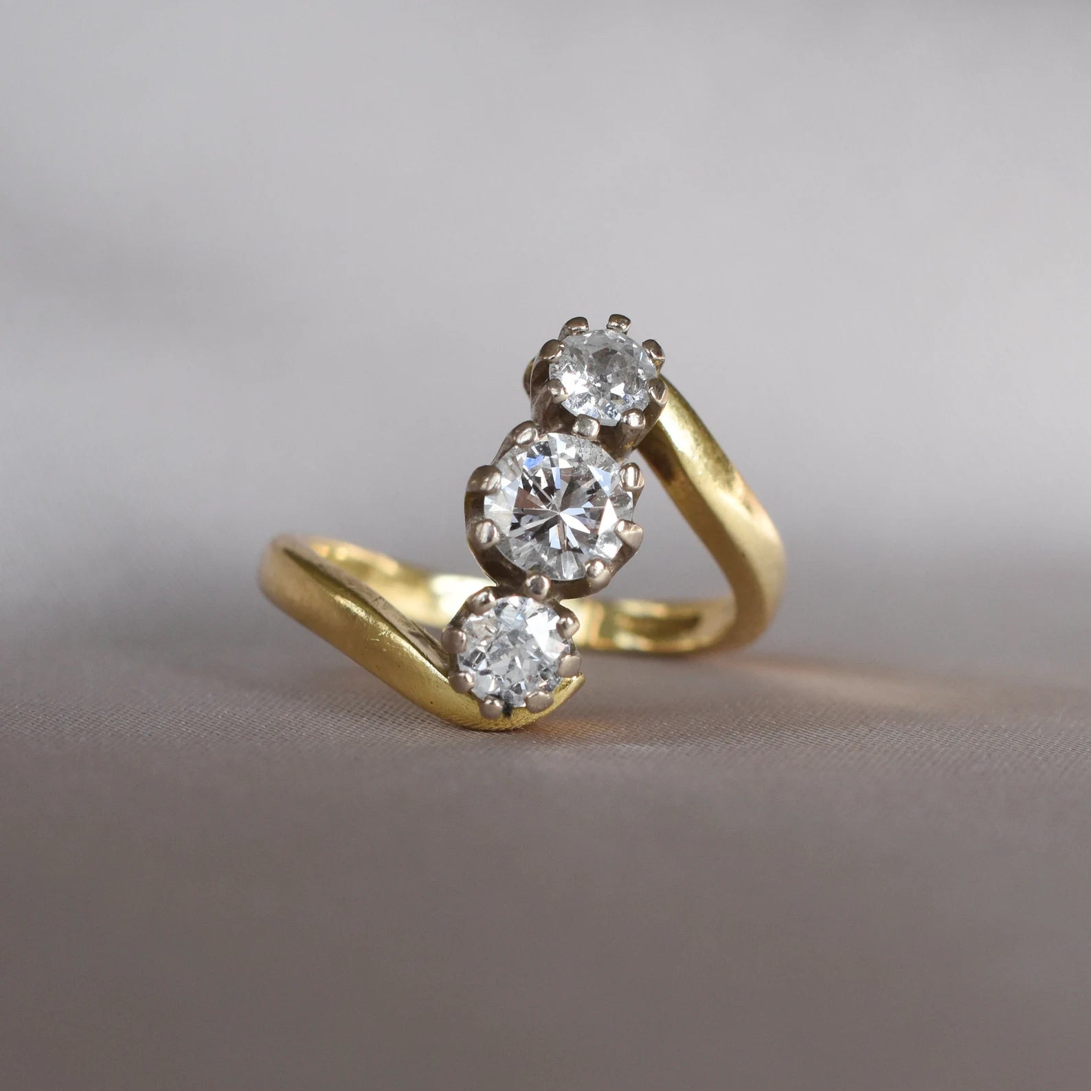 A unique Crossover Trilogy Diamond Ring set in 18k yellow gold, showcasing three sparkly diamonds for a total combined weight of approx. 0.95ct - each vertically set, rather than horizontally, in a traditional Vintage claw setting in white and yellow gold. The ring bears hallmarks for the maker, 750 and Birmingham assay office.